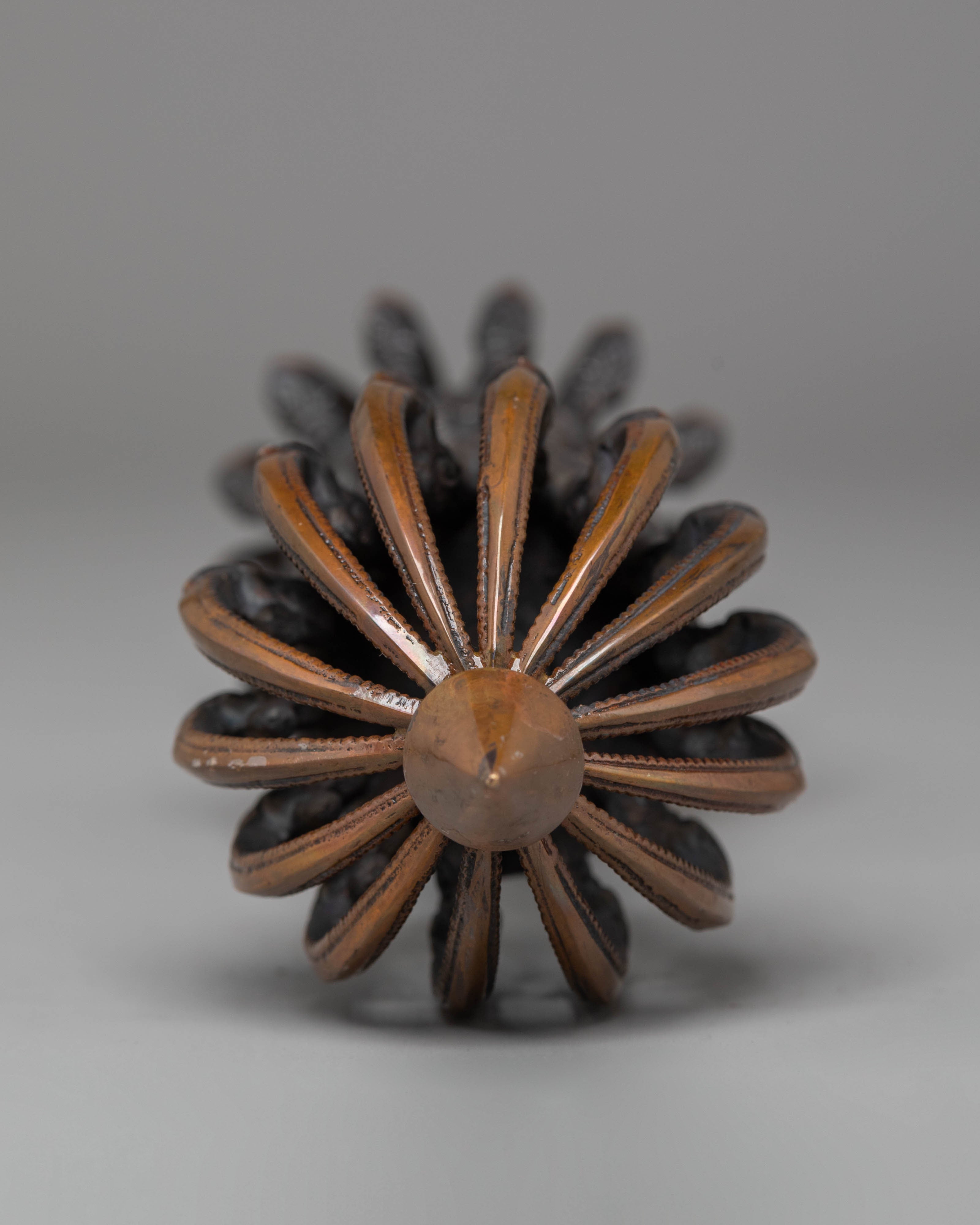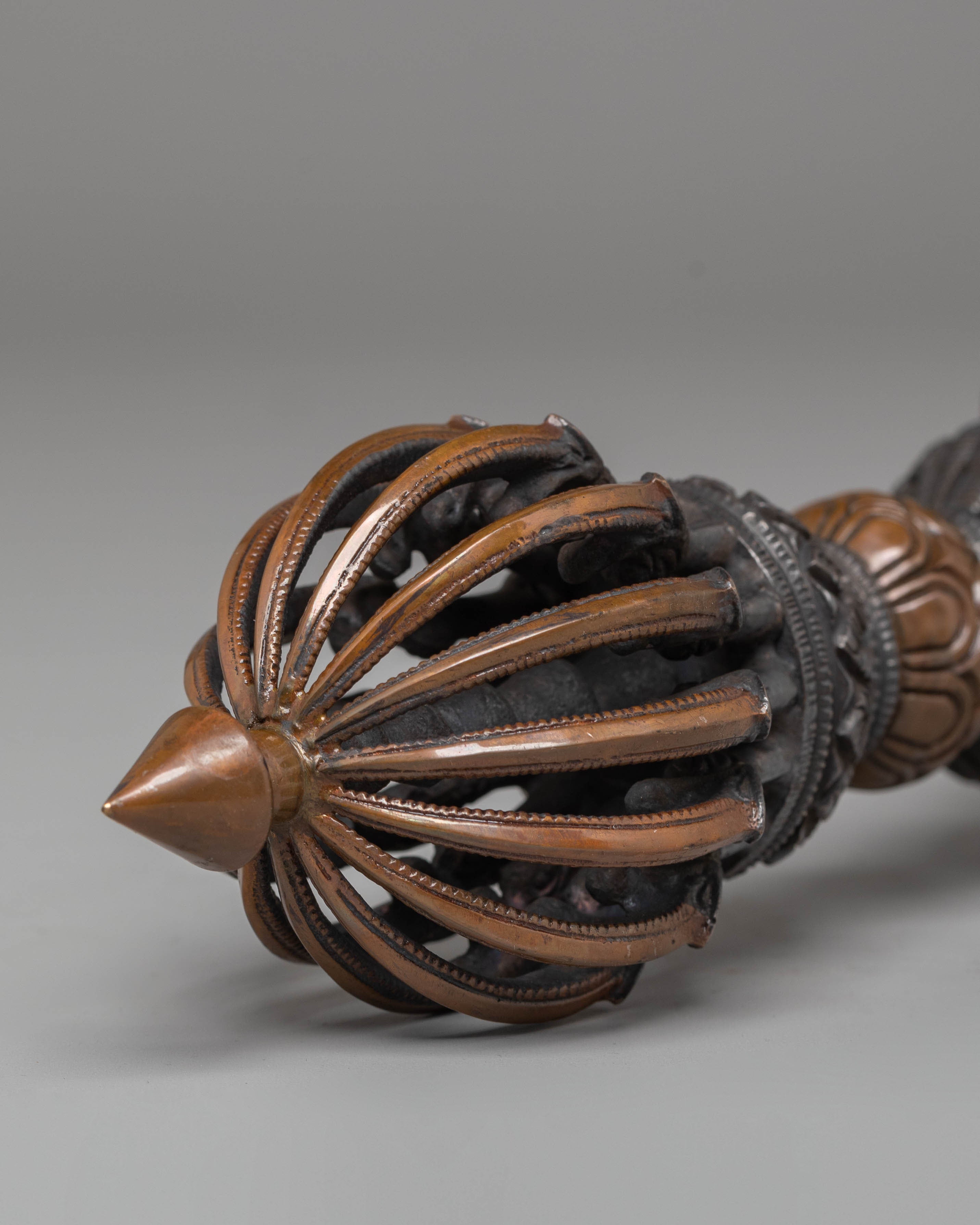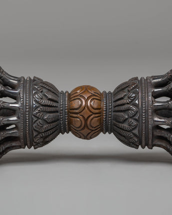 The vajra features the classic prong structure that symbolizes the fusion of compassion and enlightened wisdom. Each contour and sculpted detail pays homage to the sacred geometry of Vajrayana iconography, expressing the harmony between the physical and spiritual realms. The central sphere embodies the pure nature of the mind, while the outward prongs convey the transformative energy that supports meditative and ceremonial practices.