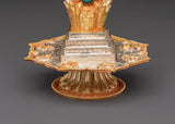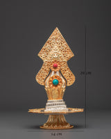 This Handmade Spiritual Torma is an essential Tibetan ceremonial relic intended to enhance your spiritual path. Standing 26 cm tall, it is precisely crafted with gold-plated and silver-plated elements, as well as copper and artificial stones such as coral and turquoise. The Torma harnesses the sacred forces of wisdom and compassion, as represented by its intricate designs. This relic, whether put on an altar or in a meditation space, enriches your spiritual activities by facilitating connection with heavenly forces and fostering calm and clarity.