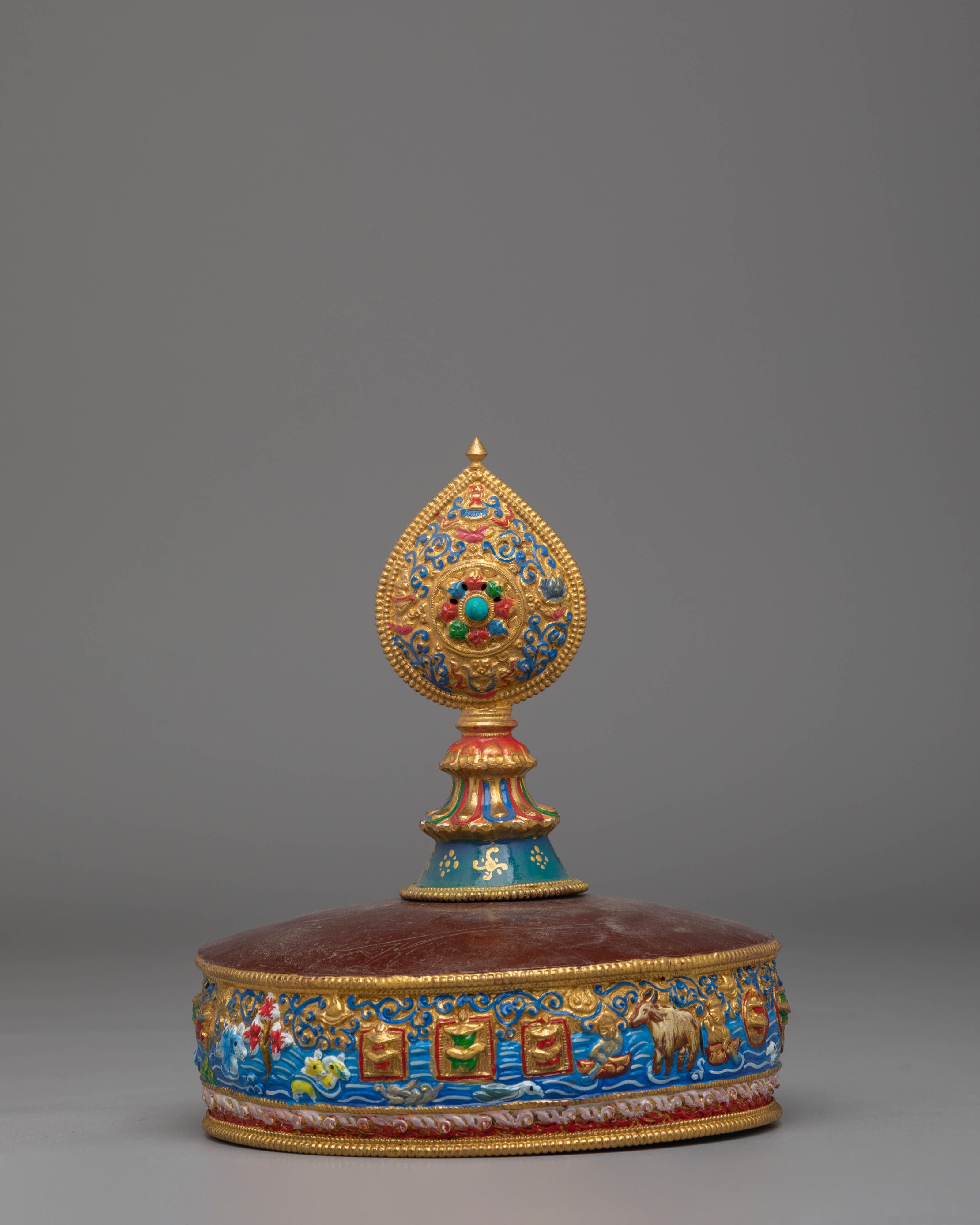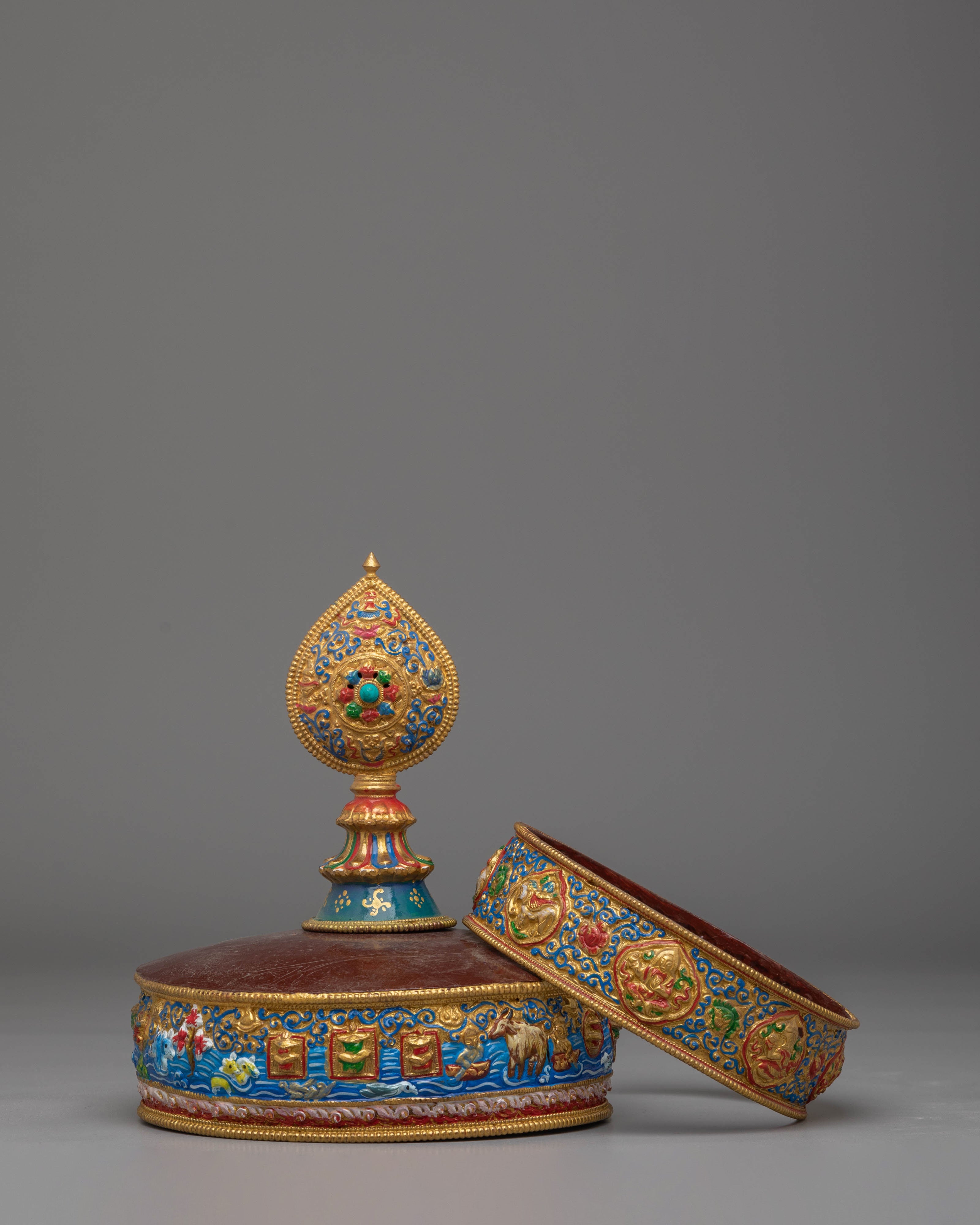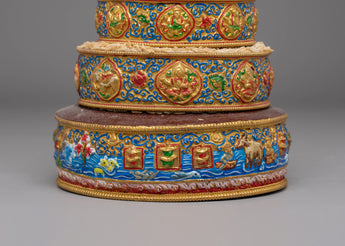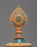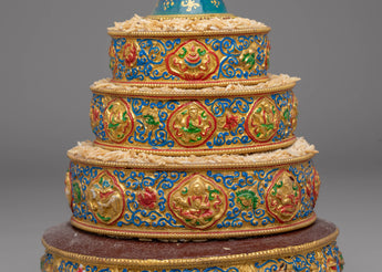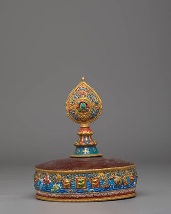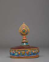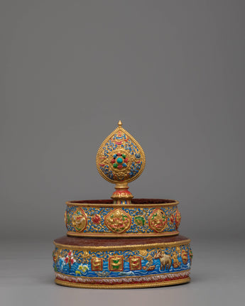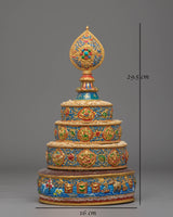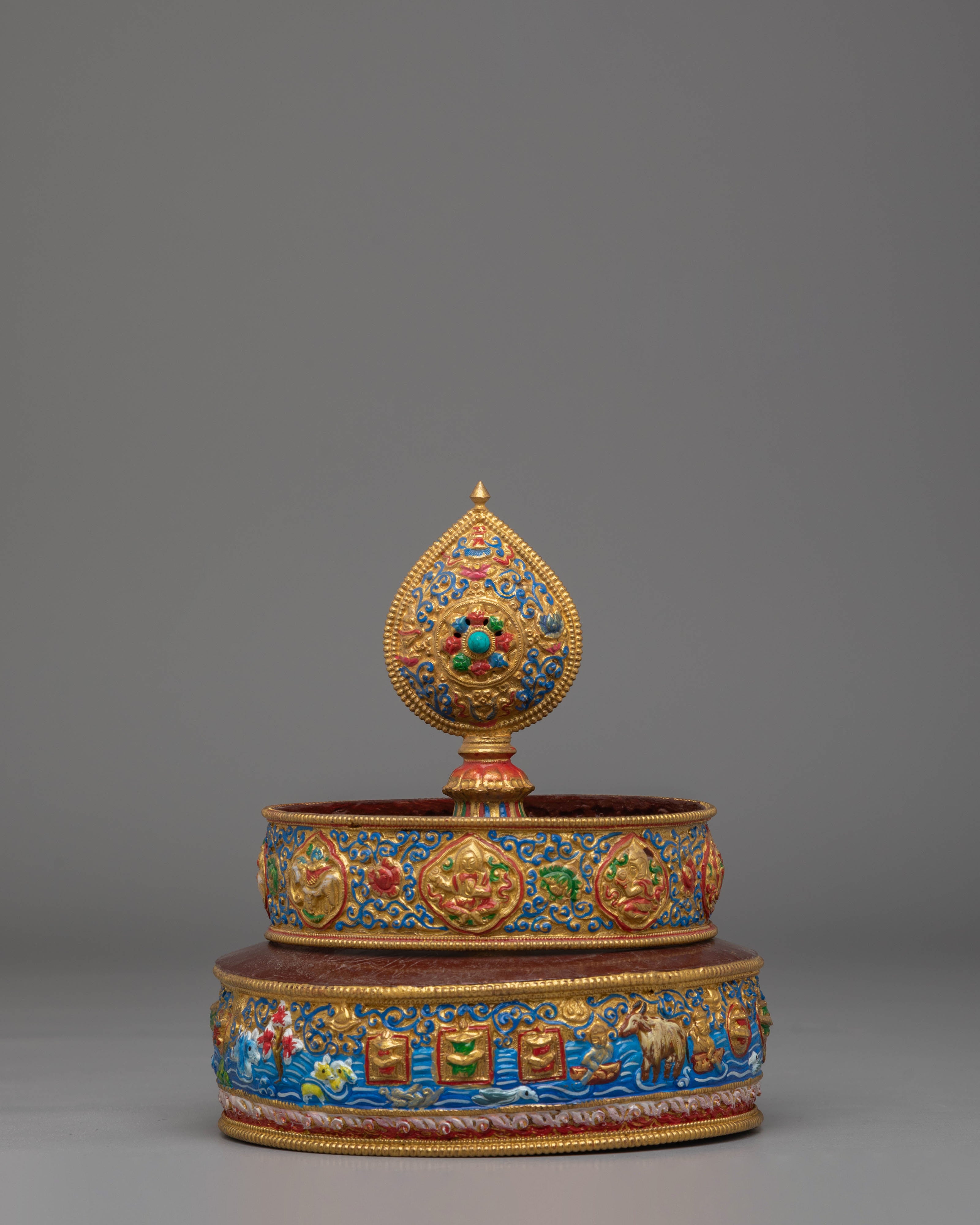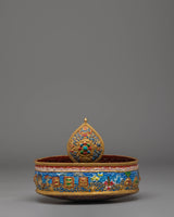 This handmade Tibetan mandala offering is a stunning representation of sacred art and spiritual devotion. Measuring 29.5 cm in height and 16 cm in width, this mandala is skillfully crafted from copper and hand-painted with gold and acrylic colors, creating a bright and intricate visual display. The mandala features various symbols and patterns, each carrying profound spiritual significance, and is adorned with beautiful gemstones that enhance its divine beauty. It serves as a powerful focal point for meditation, prayer rituals, and altar displays, bringing harmony and positive energy into any space.