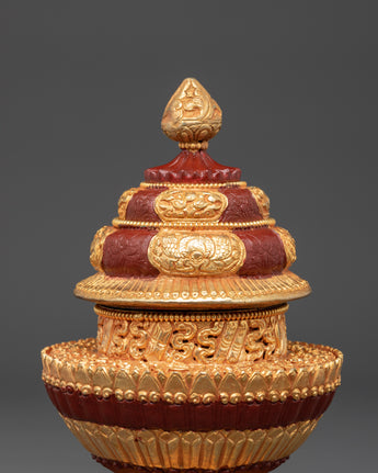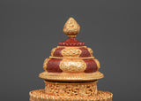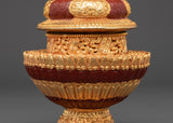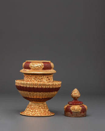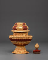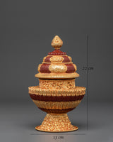 This pot, measuring 22 cm in height and 13 cm in width, is made of copper and plated with a gold finish. Its layered form, intricately embossed with auspicious motifs and floral designs, is topped with a jewel-like finial that represents spiritual richness and fulfillment. The vibrant red and gold color palette adds to its ceremonial value while highlighting the artistry rooted in Himalayan craftsmanship.