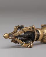 This handmade vajra embodies the essential teachings of impermanence and spiritual strength. The vajra's symmetrical design represents the unification of opposites, such as compassion and wisdom, while the five prongs symbolize the five wisdoms that Buddhists strive to attain. This sacred tool channels energy from the universe, invoking the Buddha's wisdom and protection during rituals, offering a constant reminder of the indomitable nature of truth. Its brass material lends it a sturdy, traditional aesthetic while enhancing its sacred energy.