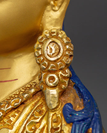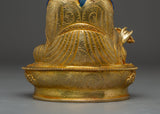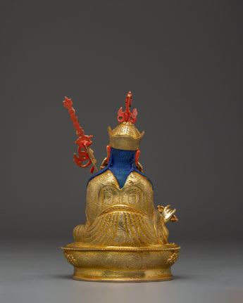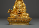 The Venerated Guru Rinpoche Artwork, also known as Padmasambhava, the founder of Tibetan Buddhism, represents enlightenment, compassion, and spiritual mastery. This handcrafted statue is 9.1" (Height) x 6.1" (Base) and weighs 1.17 kg. It is made of copper, adorned with 24K gold gilding, and enhanced with detailed gold and acrylic paints. Created by expert Nepalese artisans, it represents Himalayan Buddhism's holy traditions, making it an appealing addition to altars, meditation places, or sacred collections.