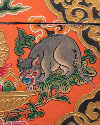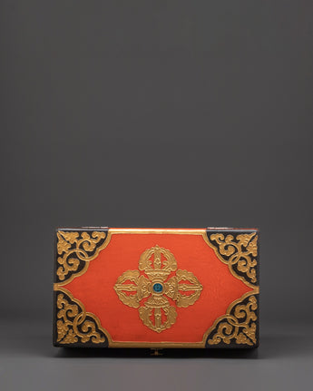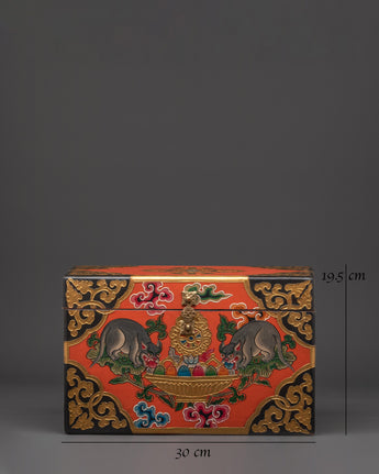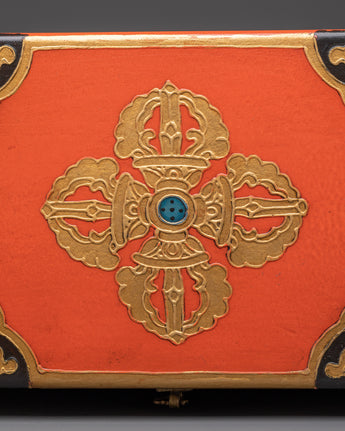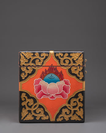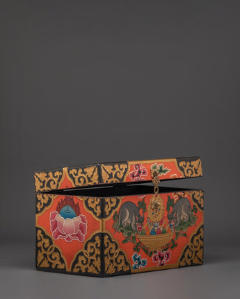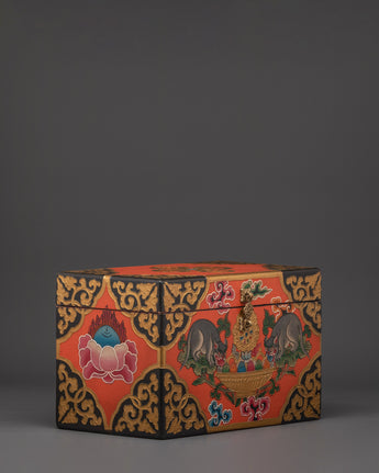 This Handmade Wooden Acrylic Box is a beautifully crafted altar storage piece, richly adorned with traditional Tibetan motifs. The vibrant hand-painted design features auspicious symbols, making it not only a practical storage chest but also a sacred addition to your spiritual space. Its bold red background with intricate gold accents reflects the artistry and deep symbolism of Himalayan Buddhist culture. Ideal for use as an altar box, it can hold offerings, ritual items, or treasured keepsakes with reverence.