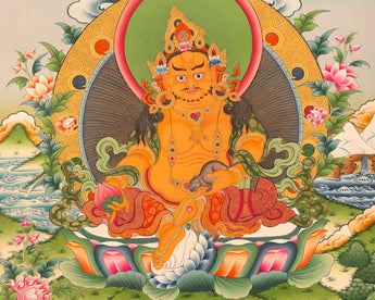 Elevate your space with our High-Quality Dzambala Thangka, a stunning symbol of prosperity and positive energy. Dzambala, also known as Jambhala, is a revered deity in Tibetan Buddhism, believed to bring blessings of wealth, health, and happiness. This Thangka is crafted with meticulous detail, using pure 24k gold, making it not only a piece of spiritual significance but also a high-quality work of art.