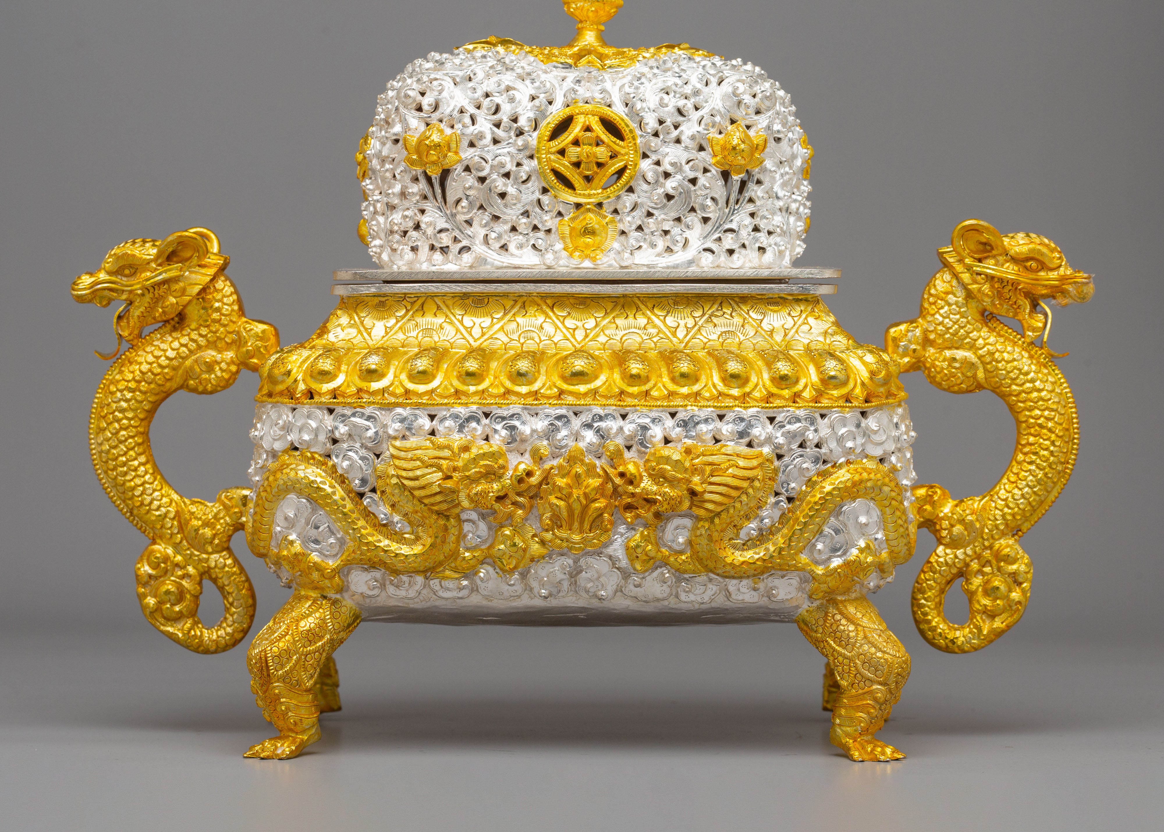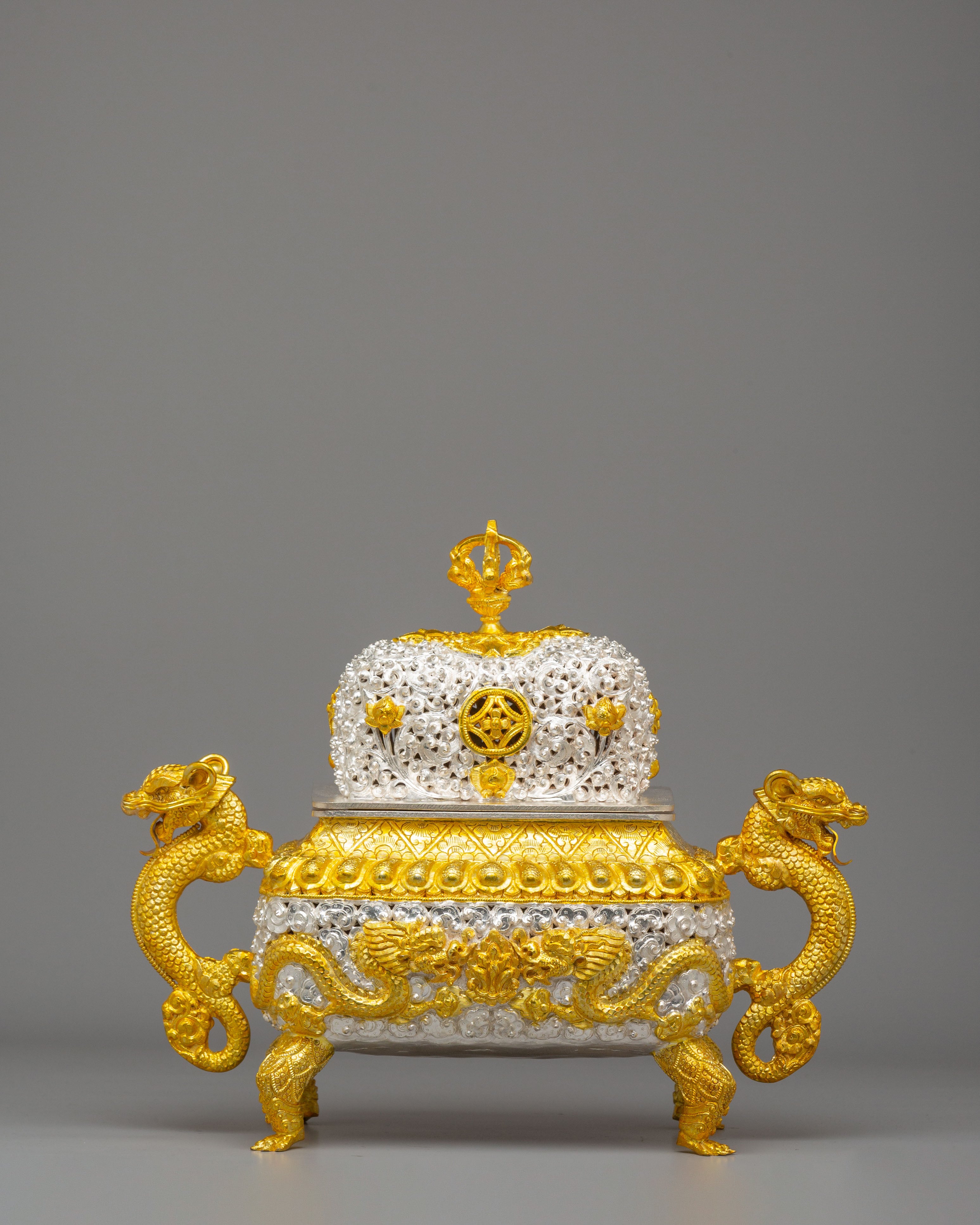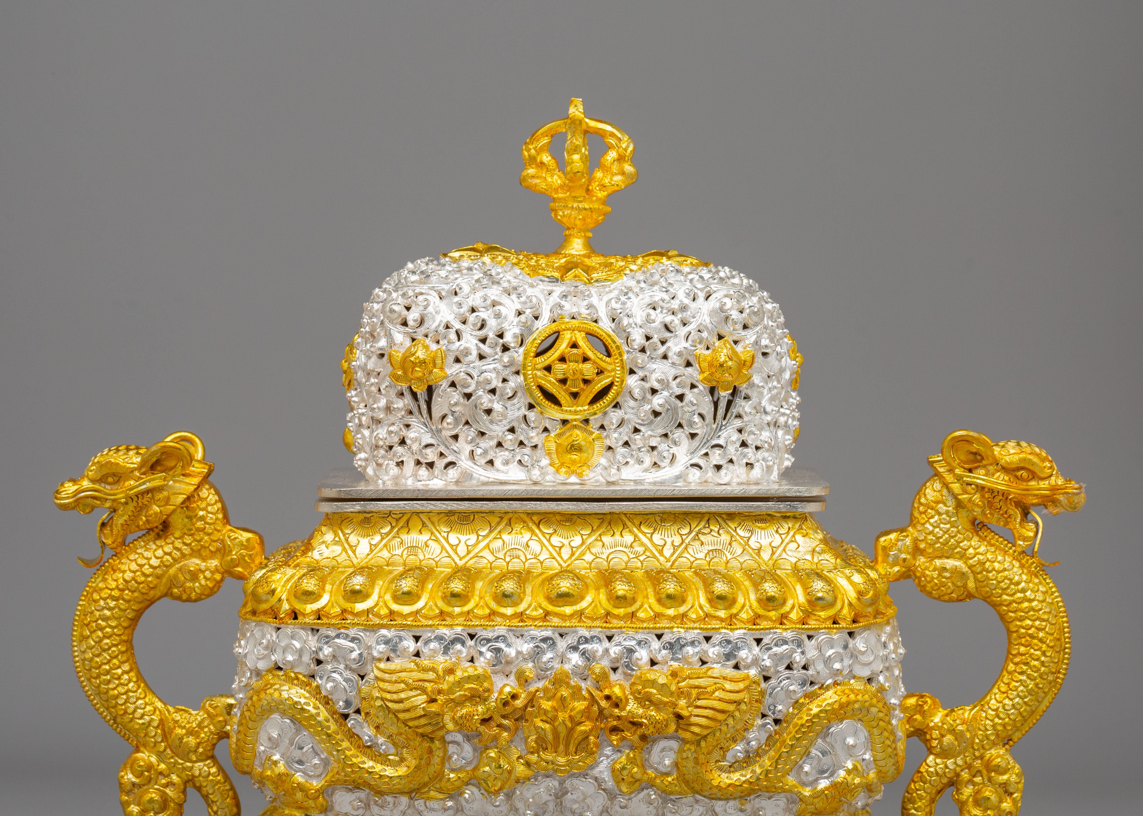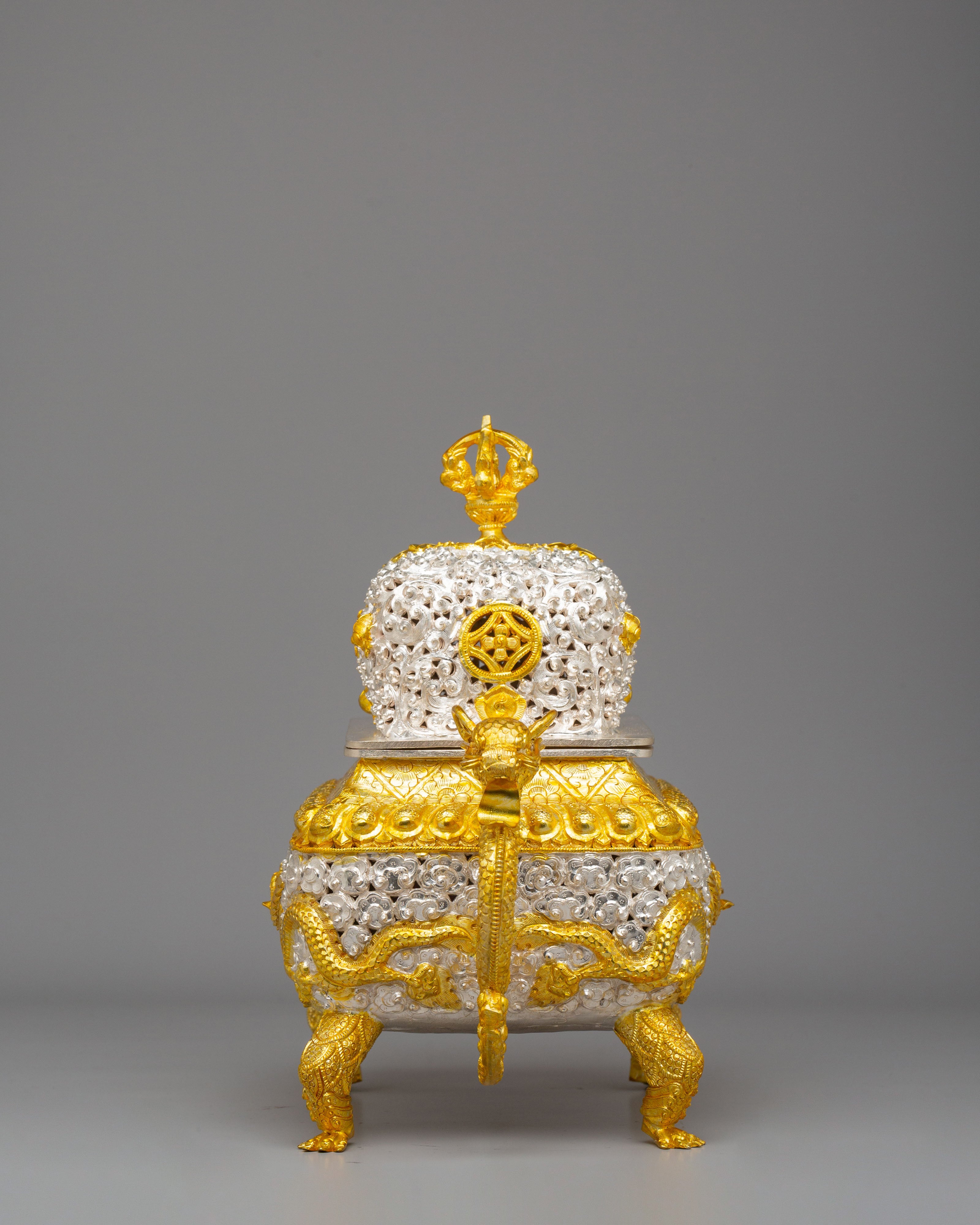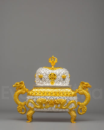 Designed to evoke tranquility and mindfulness, the Sacred Incense Burner features dragons—symbols of strength and wisdom in Buddhist iconography—gracing its handles. The symbolic motifs of peace and enlightenment, such as the lotus design and the intricate crown on top, enhance the spiritual essence of this piece. The dragon handles, together with the carefully applied gold and silver plating, represent the balance of yin and yang—qualities that encourage harmony and peace in meditation spaces. These spiritual motifs emphasize the burner's role in promoting purity and enlightenment during meditation and prayer.