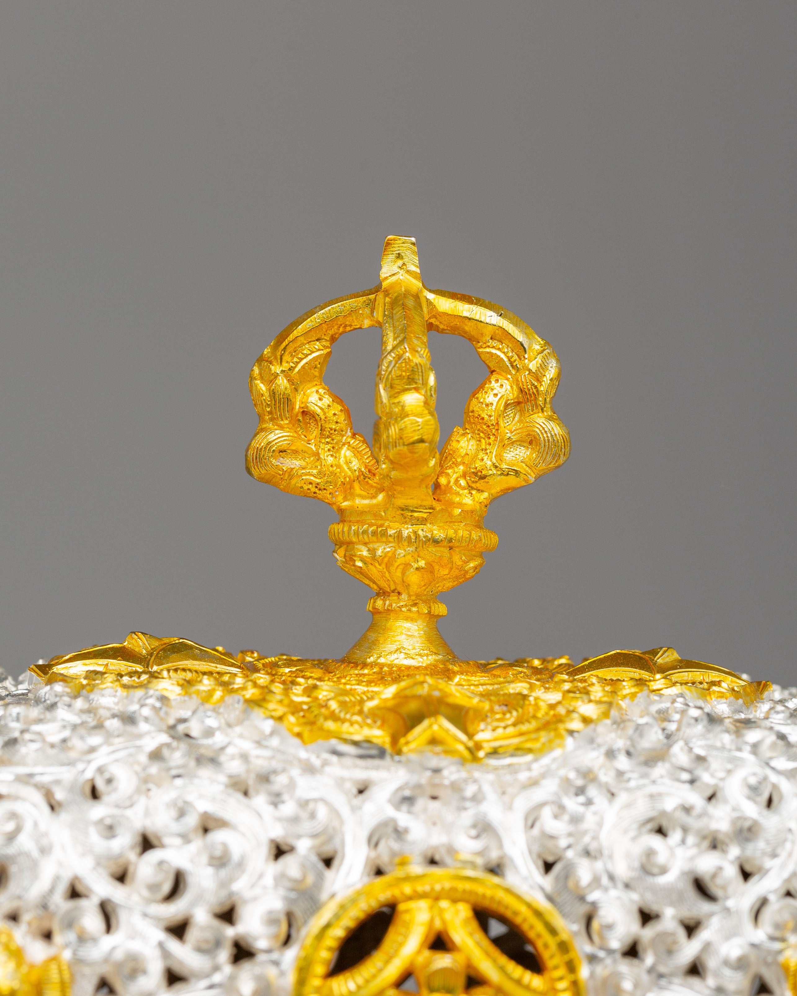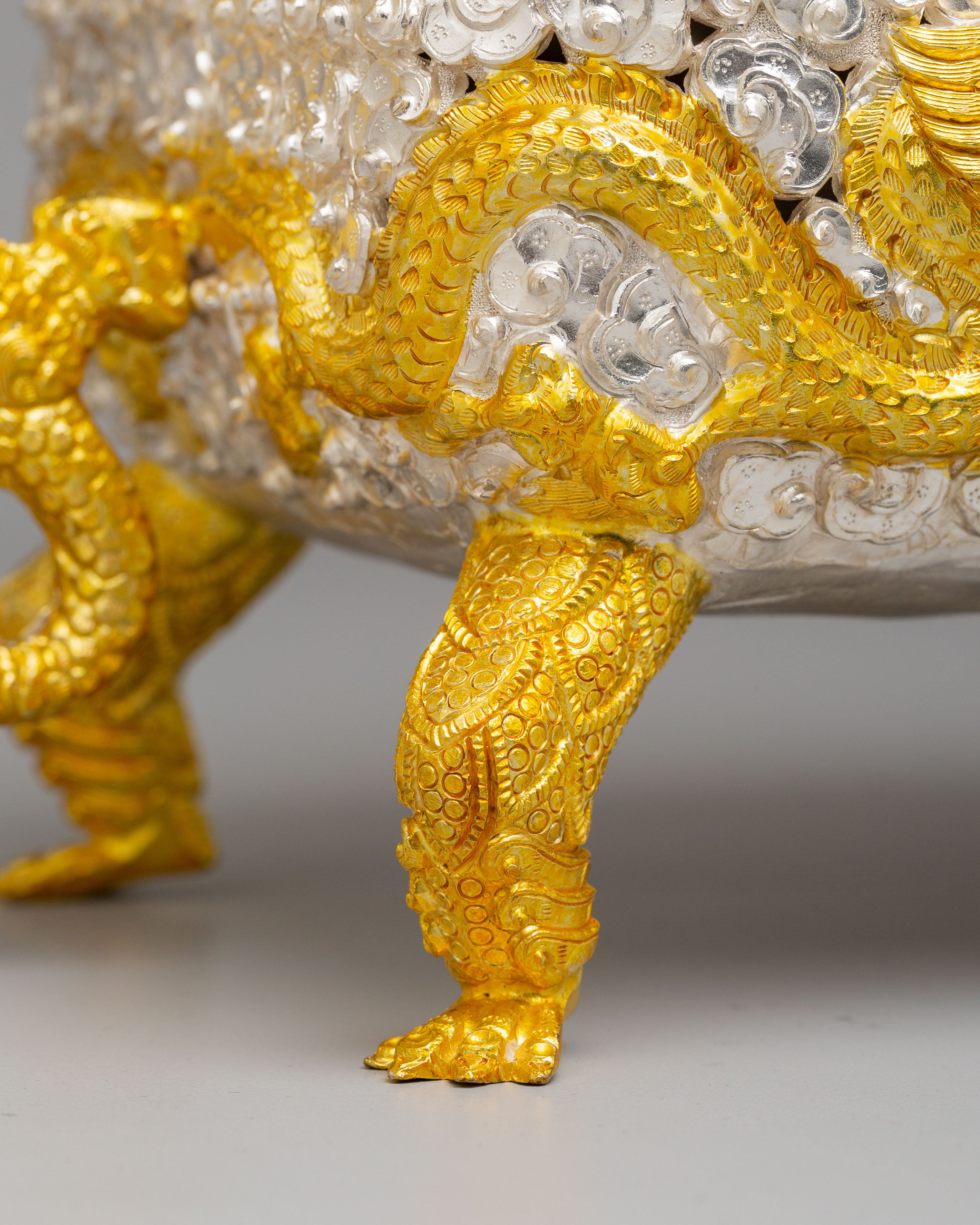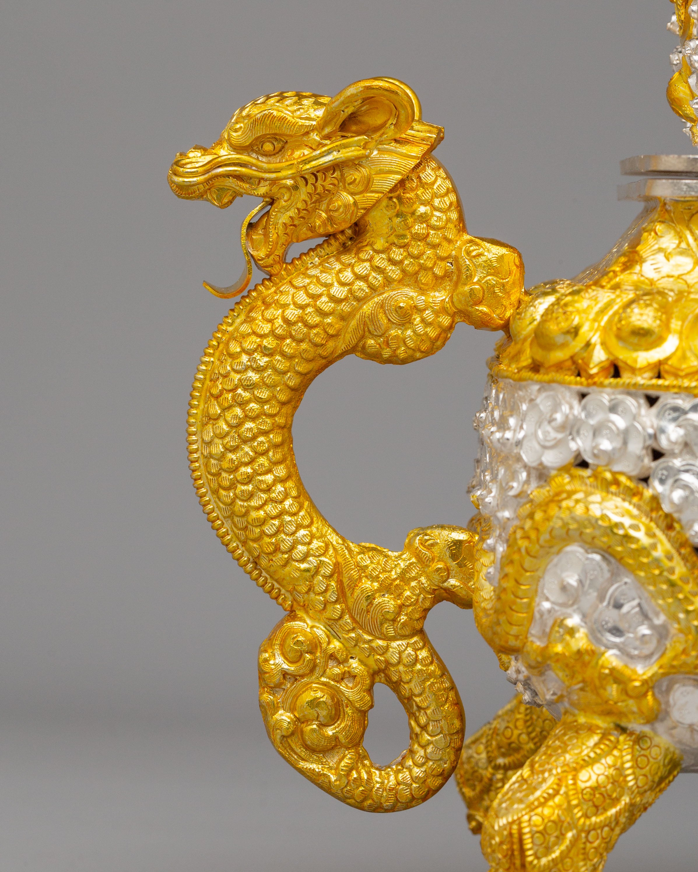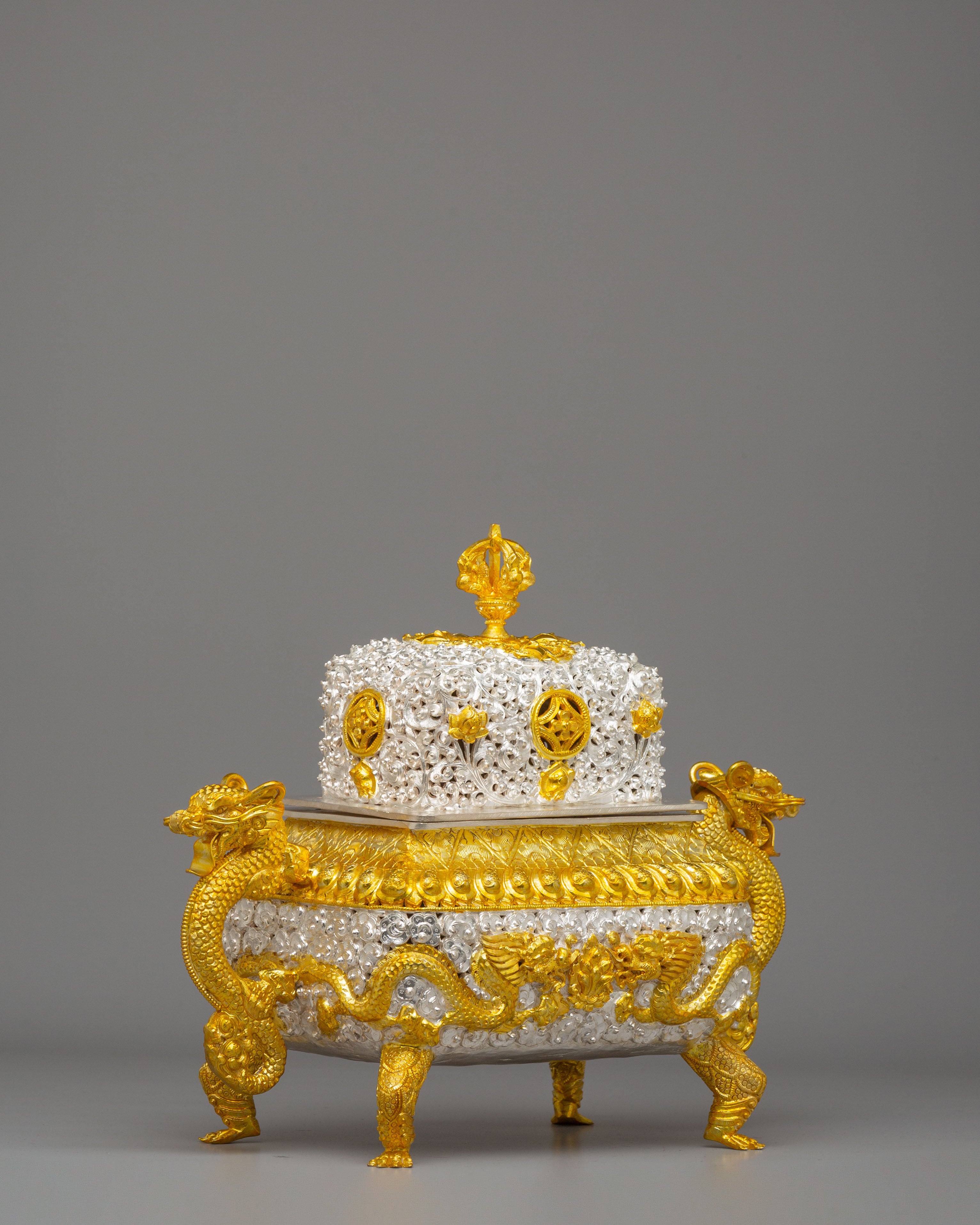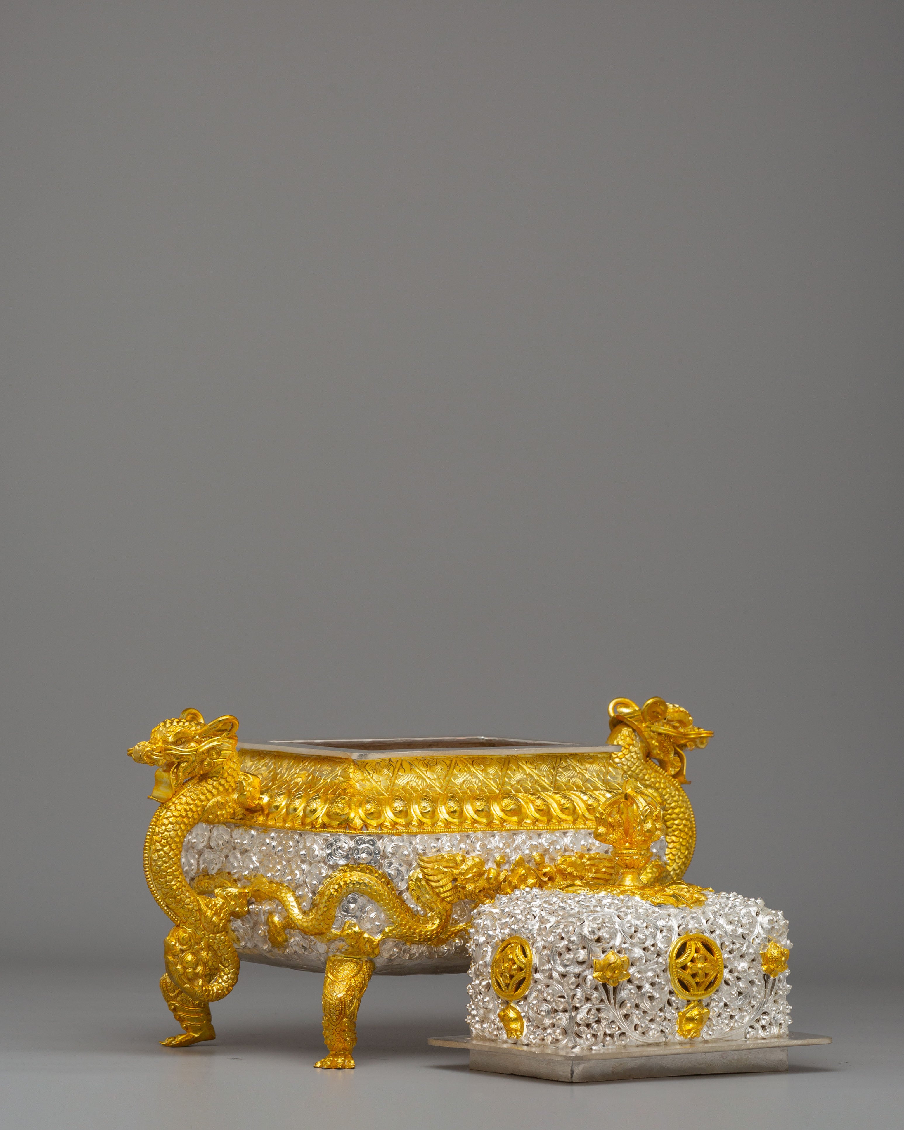 Designed to evoke tranquility and mindfulness, the Sacred Incense Burner features dragons—symbols of strength and wisdom in Buddhist iconography—gracing its handles. The symbolic motifs of peace and enlightenment, such as the lotus design and the intricate crown on top, enhance the spiritual essence of this piece. The dragon handles, together with the carefully applied gold and silver plating, represent the balance of yin and yang—qualities that encourage harmony and peace in meditation spaces. These spiritual motifs emphasize the burner's role in promoting purity and enlightenment during meditation and prayer.