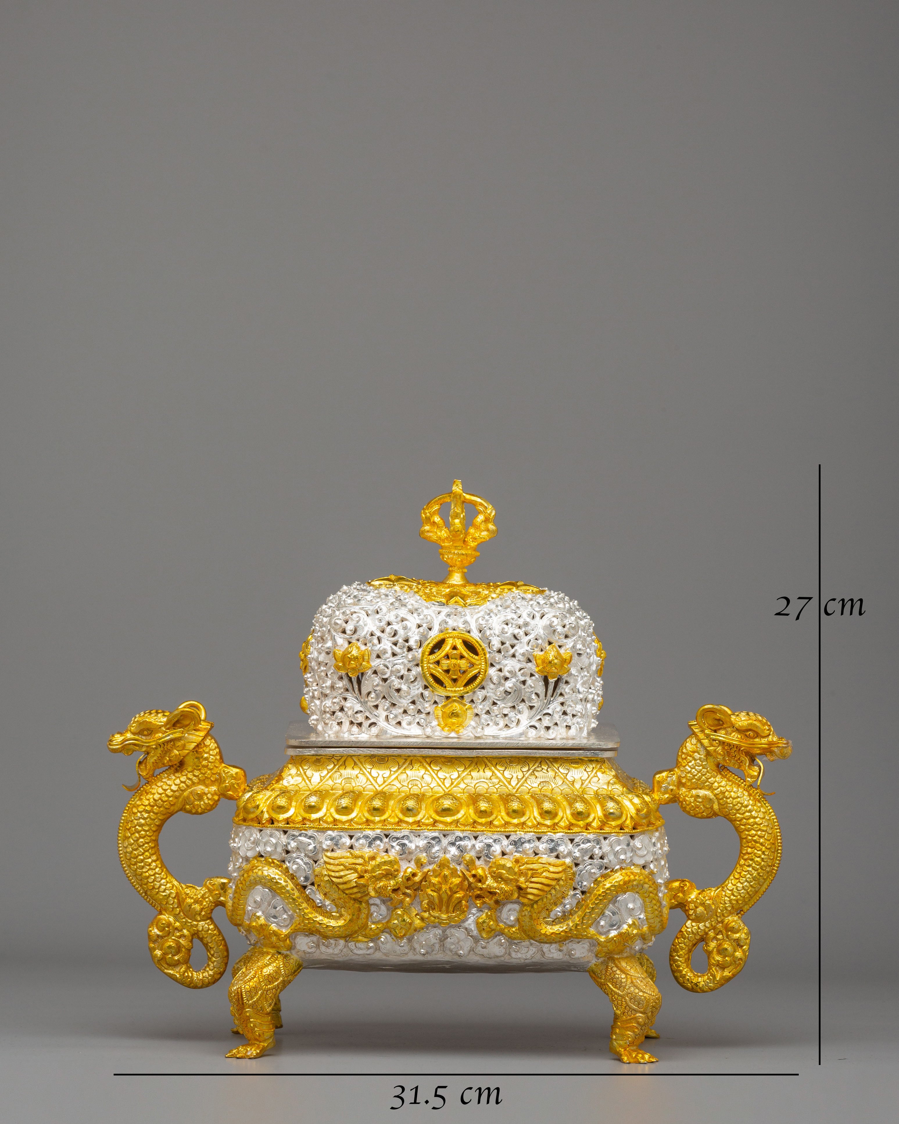 The Sacred Incense Burner is a crafted traditional Buddhist decor piece, measuring 27cm in height, 31.5cm in length, and 17.5cm in width. Weighing 2.21 kg, this burner is made from a copper body, electro-plated with both silver and gold finishes . The intricate detailing in both the body and the ornate dragons that serve as handles sets this burner apart from other incense holders. The handle design adds a unique touch, showcasing both symbolic and aesthetic importance. The combination of copper, electro-silver plating, and electro-gold plating gives the burner a stunning, multi-layered sheen that is both visually striking and spiritually significant.