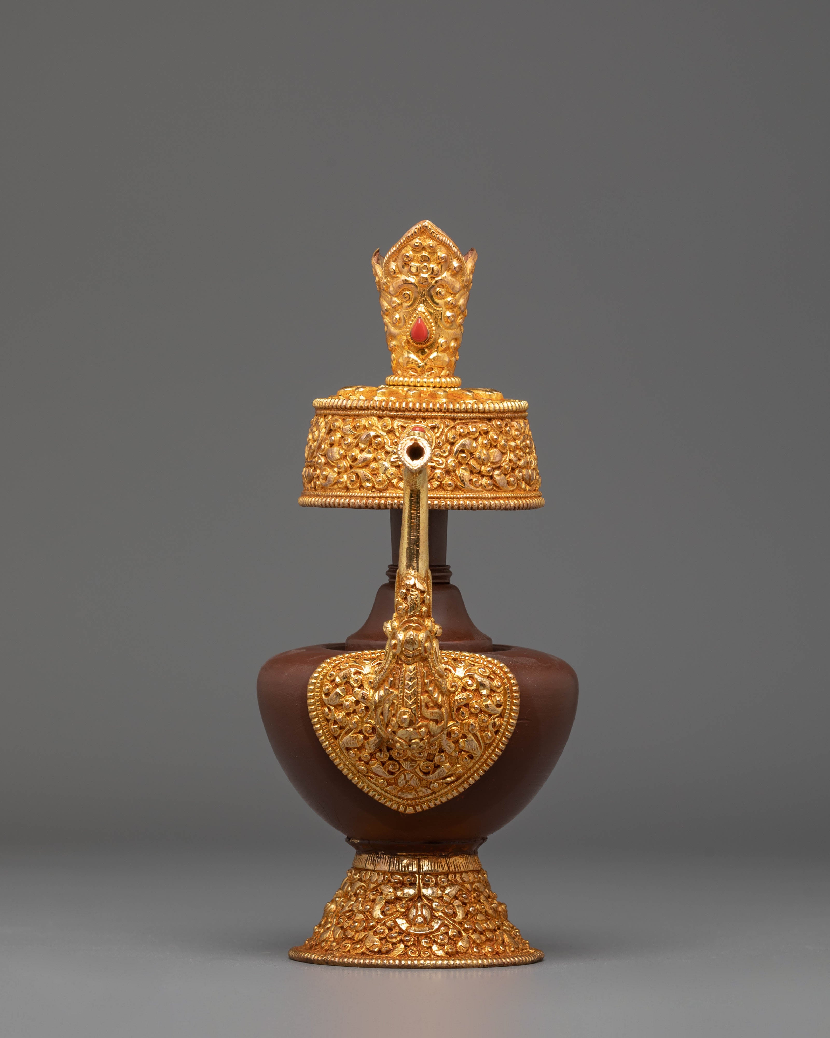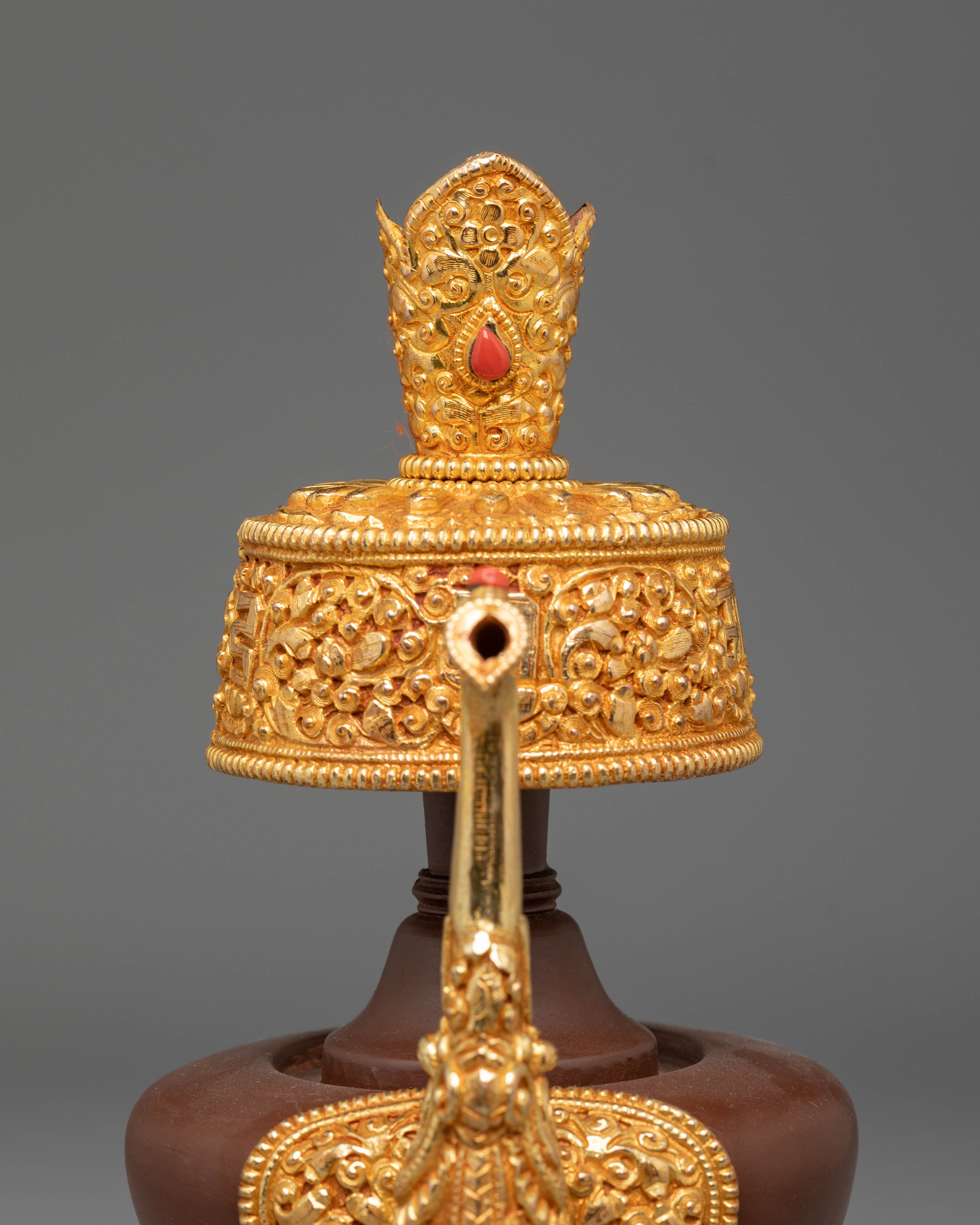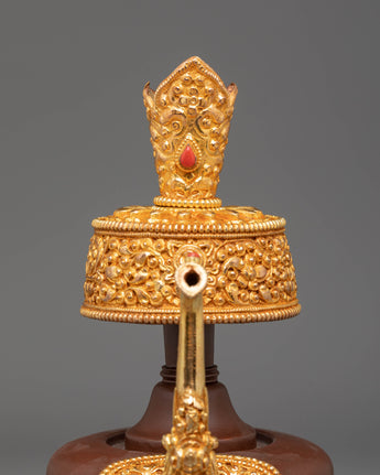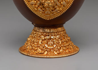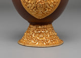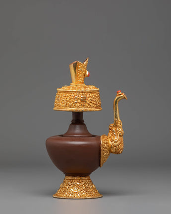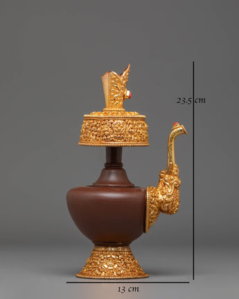The design features intricate gold-plated details around the base and handle, symbolizing the sacred nature of the offering vessel. The copper body is engraved with traditional Tibetan motifs, and the fire gold plating adds both beauty and spiritual significance. These vessels are often used during ritual offerings and prayers to hold sacred substances, such as rice or water, offering a physical symbol of devotion and spiritual purity. The acrylic color highlights the fine craftsmanship and enhances the ceremonial atmosphere during practices.