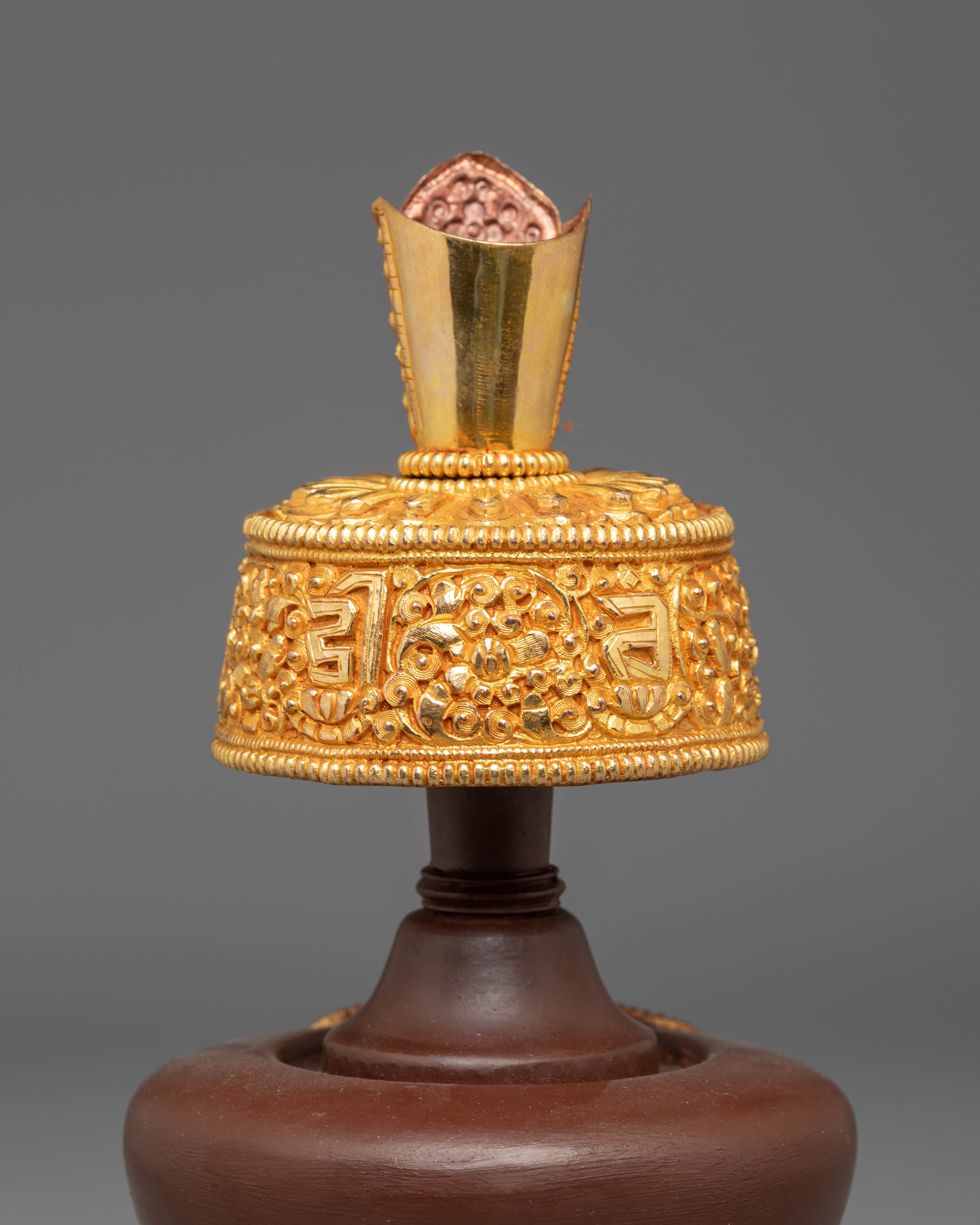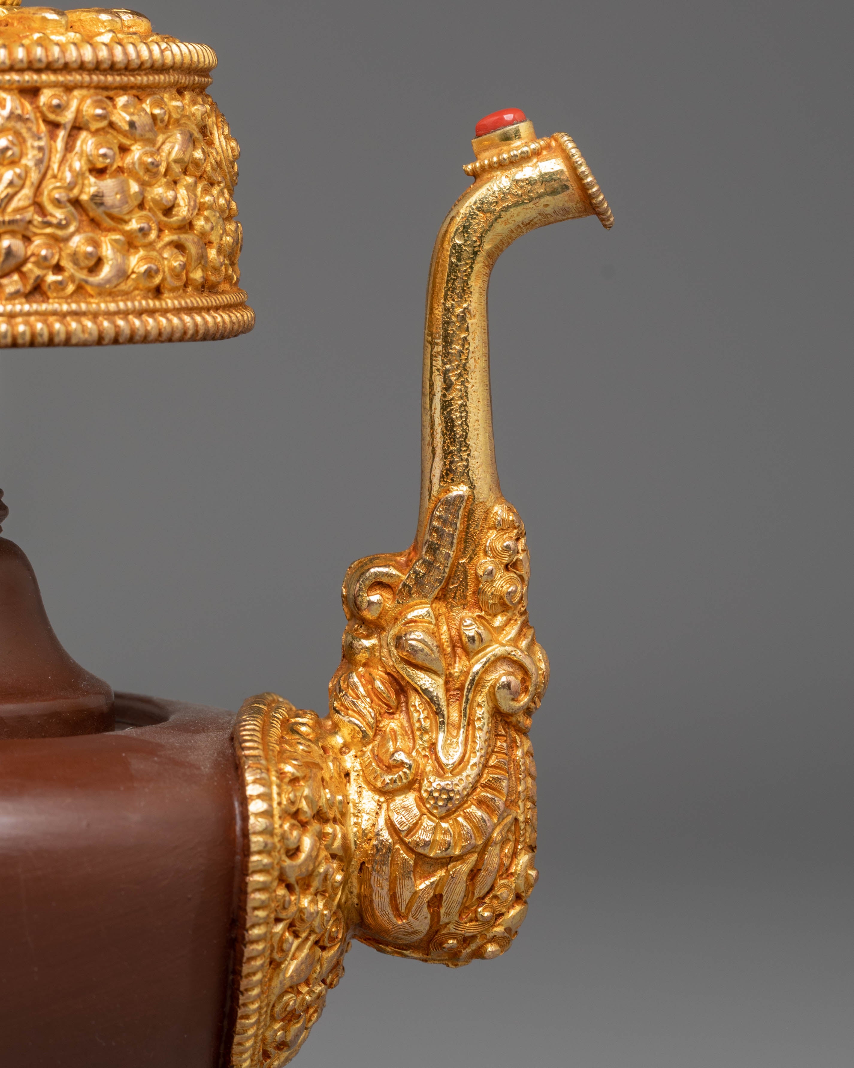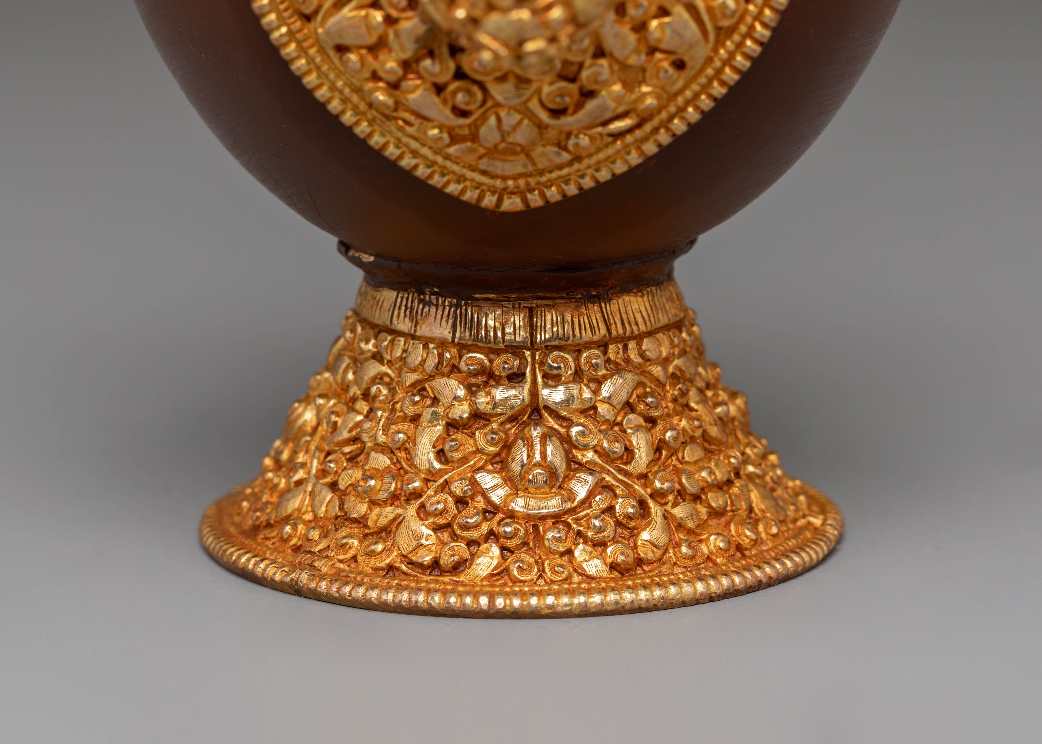 The design features intricate gold-plated details around the base and handle, symbolizing the sacred nature of the offering vessel. The copper body is engraved with traditional Tibetan motifs, and the fire gold plating adds both beauty and spiritual significance. These vessels are often used during ritual offerings and prayers to hold sacred substances, such as rice or water, offering a physical symbol of devotion and spiritual purity. The acrylic color highlights the fine craftsmanship and enhances the ceremonial atmosphere during practices.