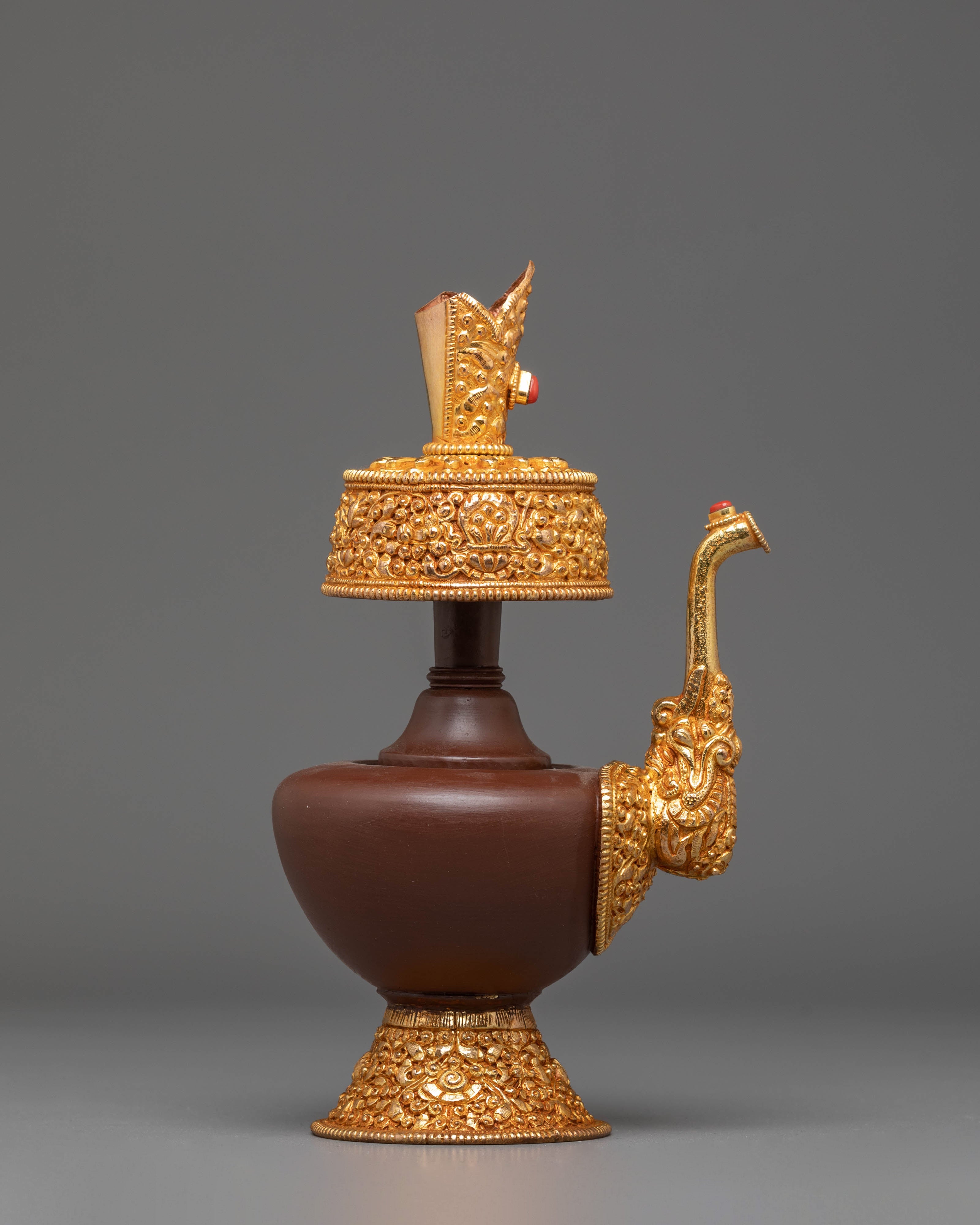 Water is essential in both Hindu and Buddhist rites, and it is always present on the altar, either in a pricey pot or in another container. A bhumba is a pot shaped like a flat jar, featuring a pipe to draw out the water, and is elaborately embellished with valuable stones and metal.