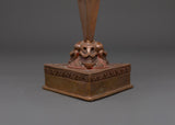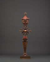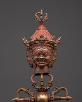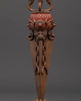 Phurba is expertly handcrafted from oxidized copper, which highlights its spiritual presence. Hand-painted acrylic color highlights intricate elements, including the crown, facial features, and ritual symbols. Every detail of this sculpture, from the triple-sided blade to the expressive wrathful deity, is rich with mystical symbolism. With a weight of 24.5kg and a width of 14cm, it serves as both a formidable ritual instrument and an eye-catching altar centerpiece.