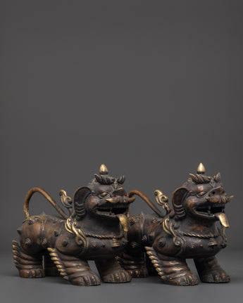 Himalayan Guardian Lion Sculptures Set | Sacred Bronze Protector Pair