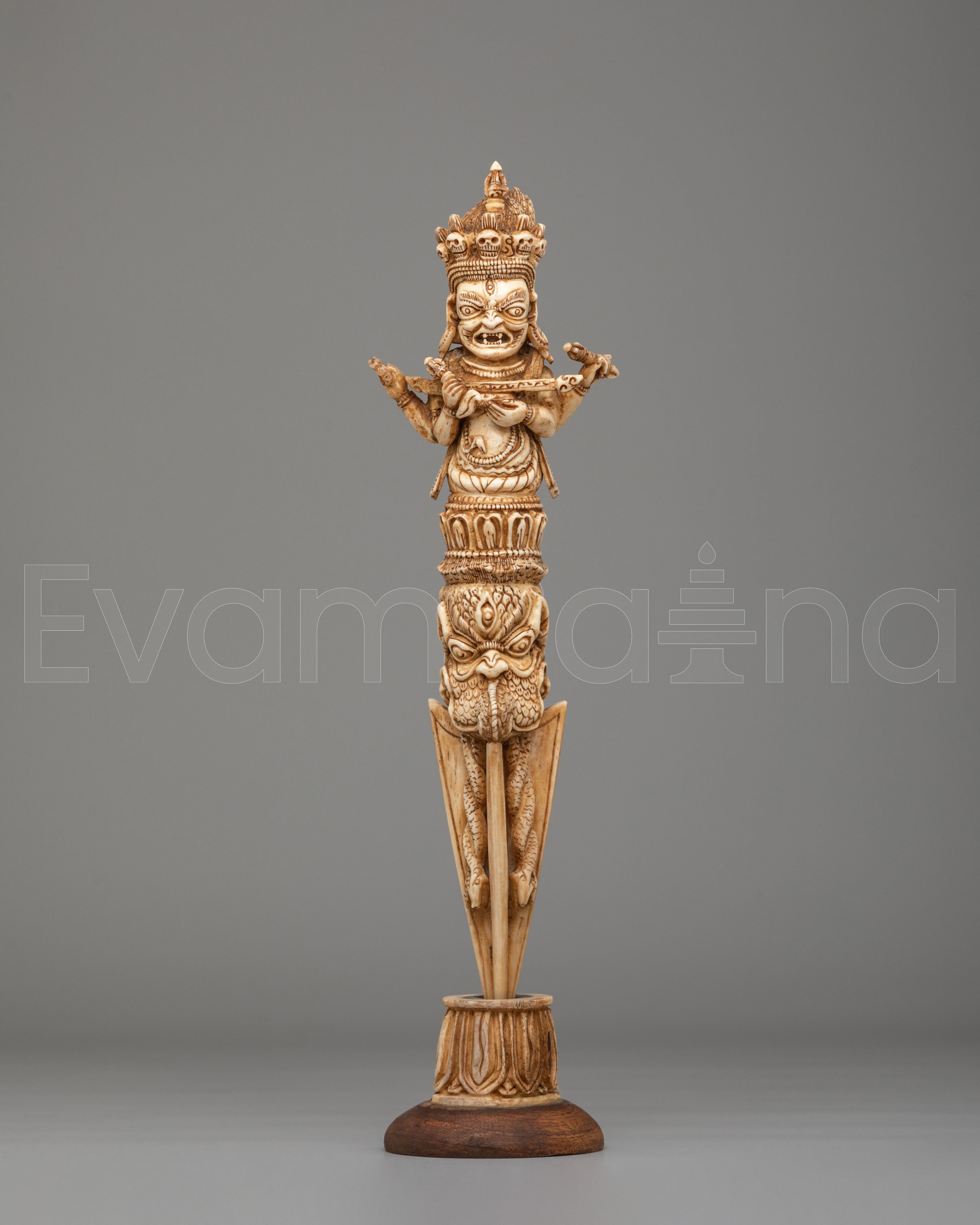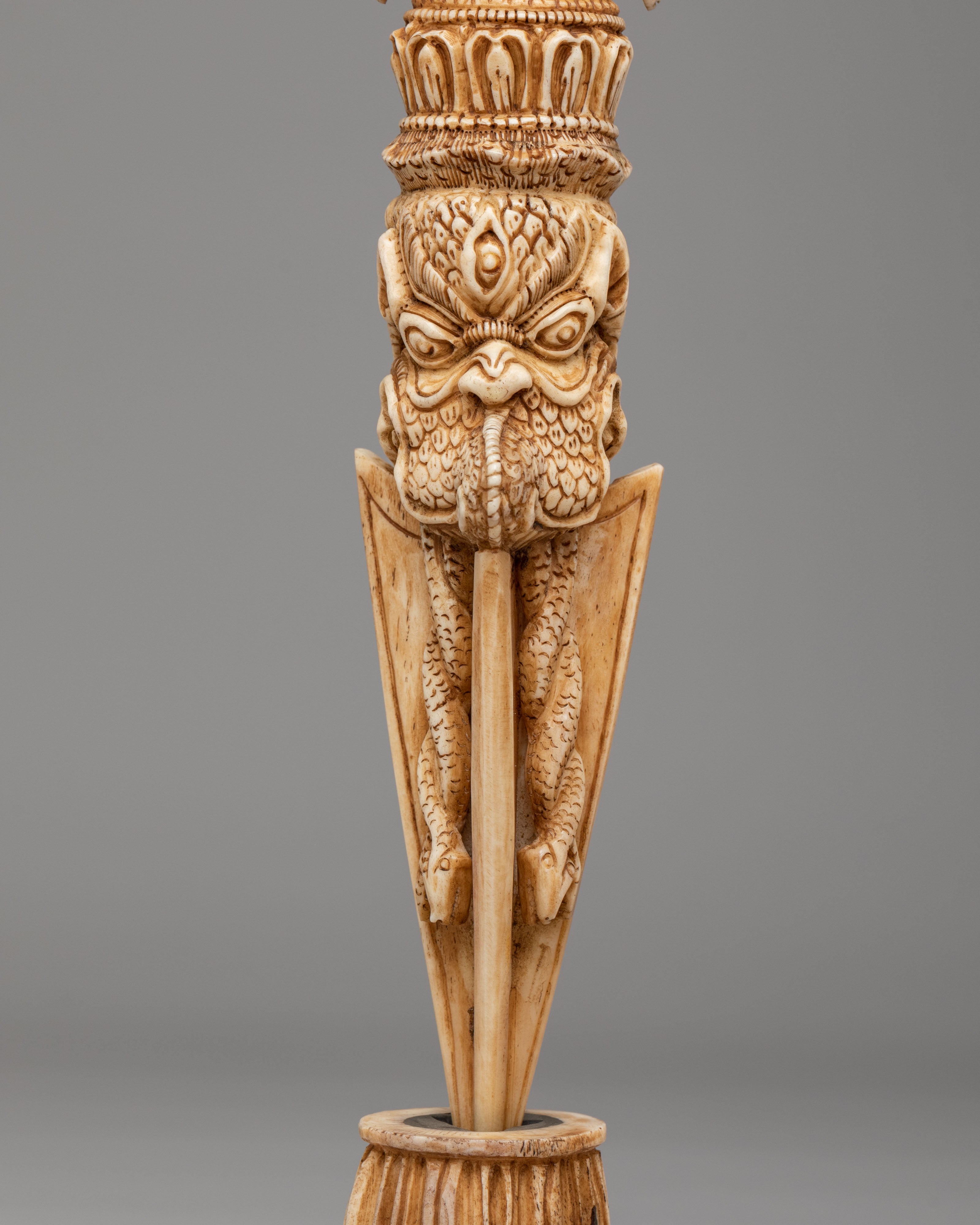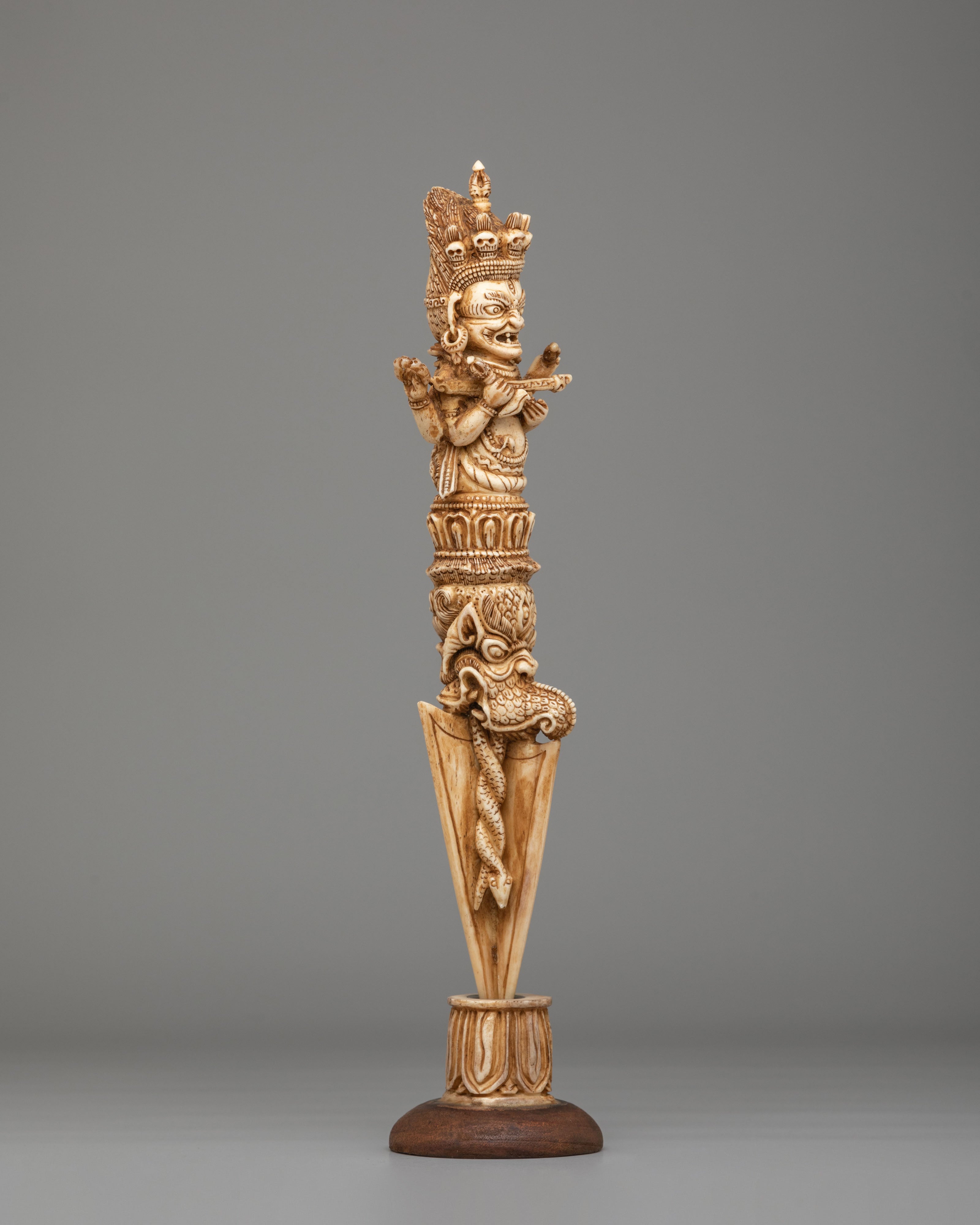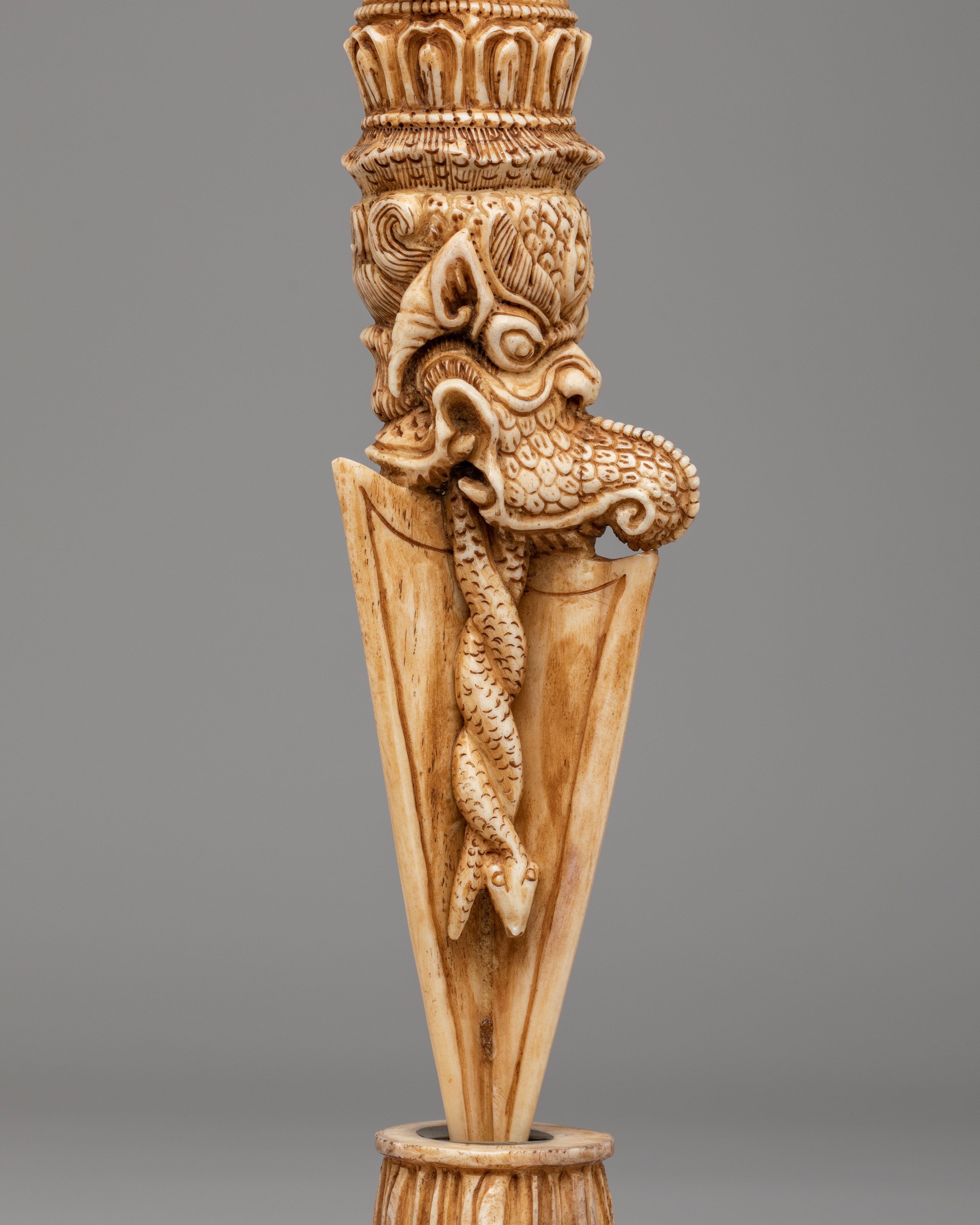 Discover the Himalayan Ritual Phurba, a sacred Tibetan artifact crafted from ethically sourced buffalo bones. This ritual dagger, with intricate carvings, represents the power to cut through negative energies and obstacles. The three-faced design on top of the Phurba symbolizes the union of wisdom, compassion, and power. It is revered for its ability to ward off harmful forces and invoke spiritual protection. The finely detailed craftsmanship showcases the rich Himalayan artistic traditions, making it not only a spiritual tool but also a beautiful piece of cultural heritage.