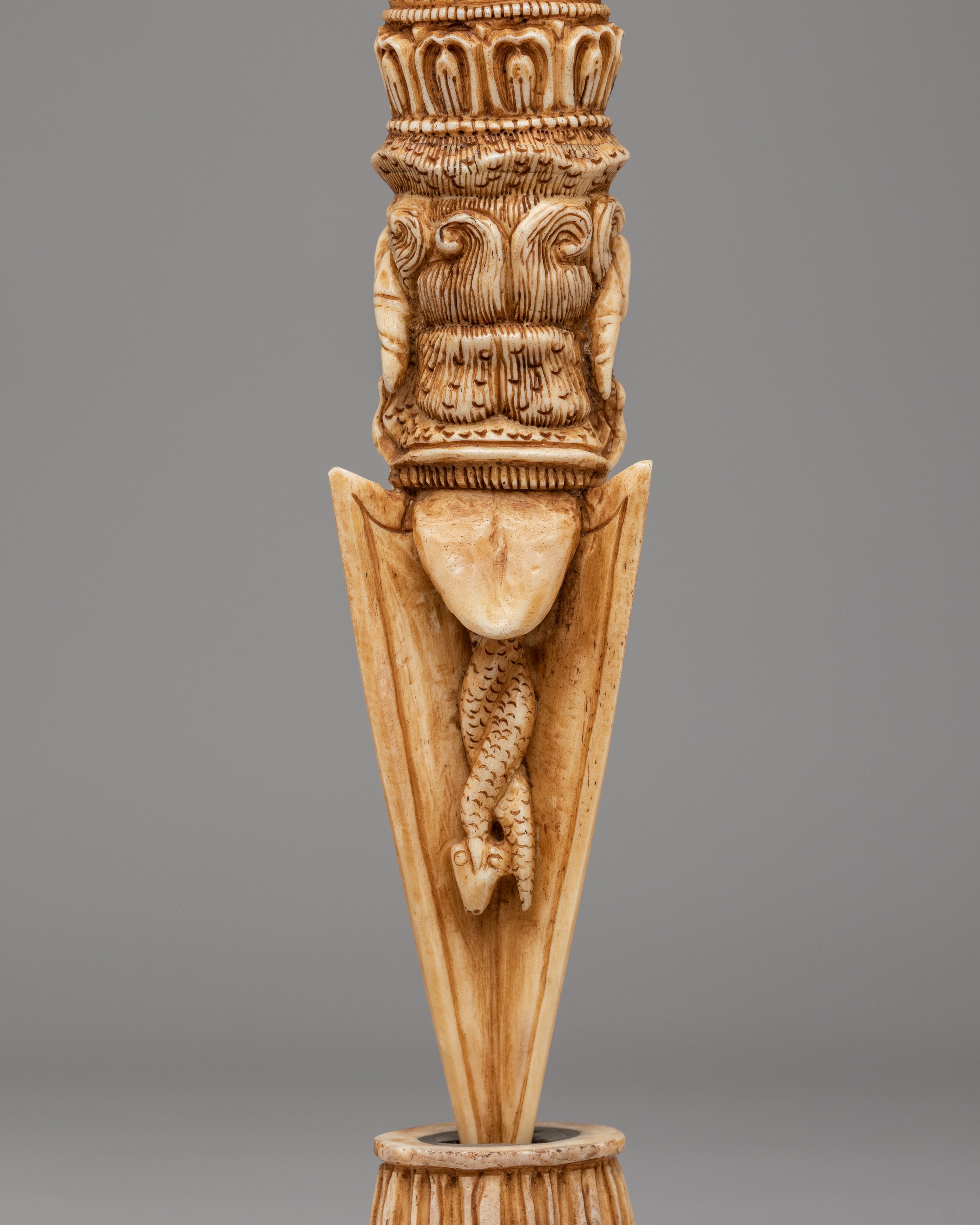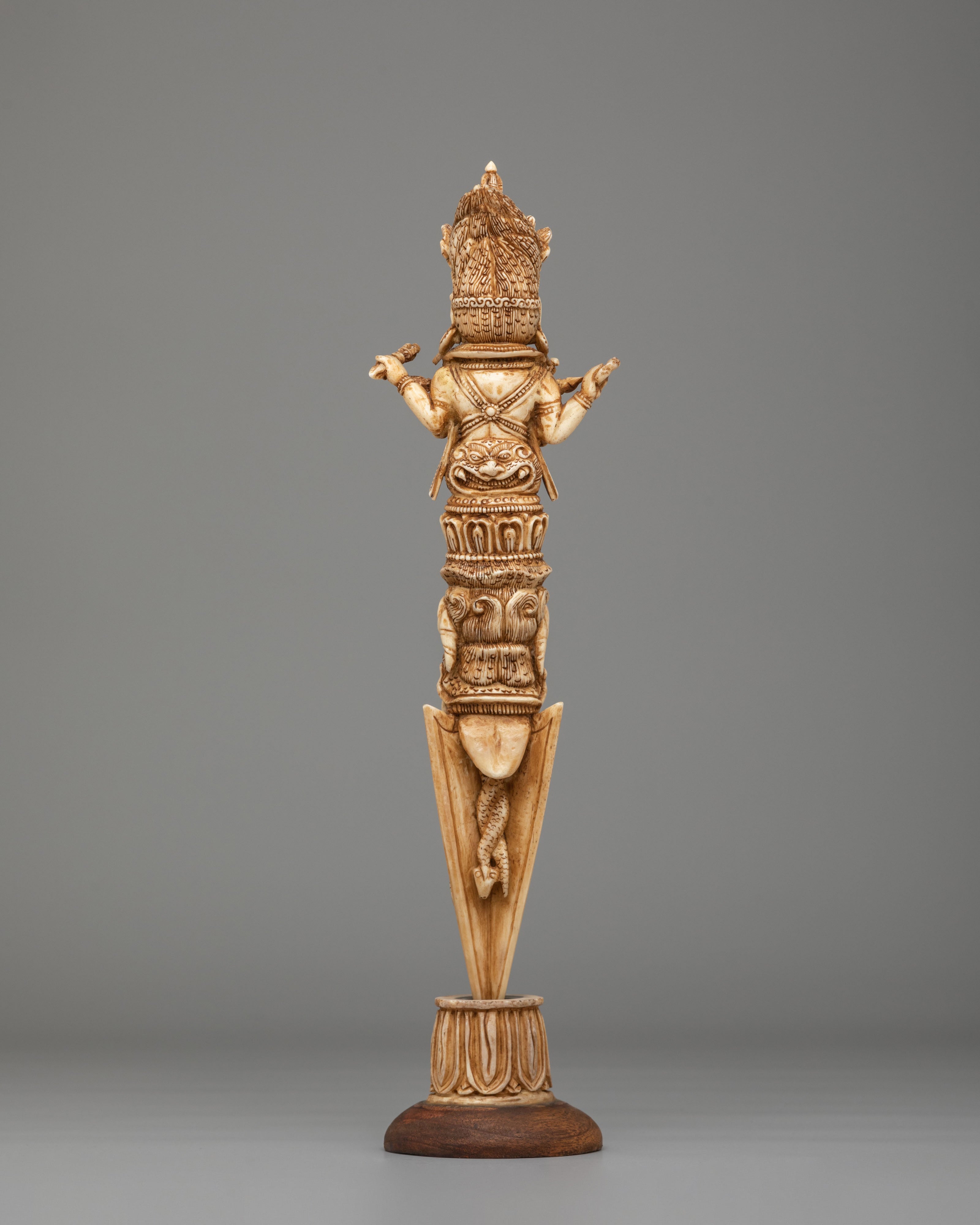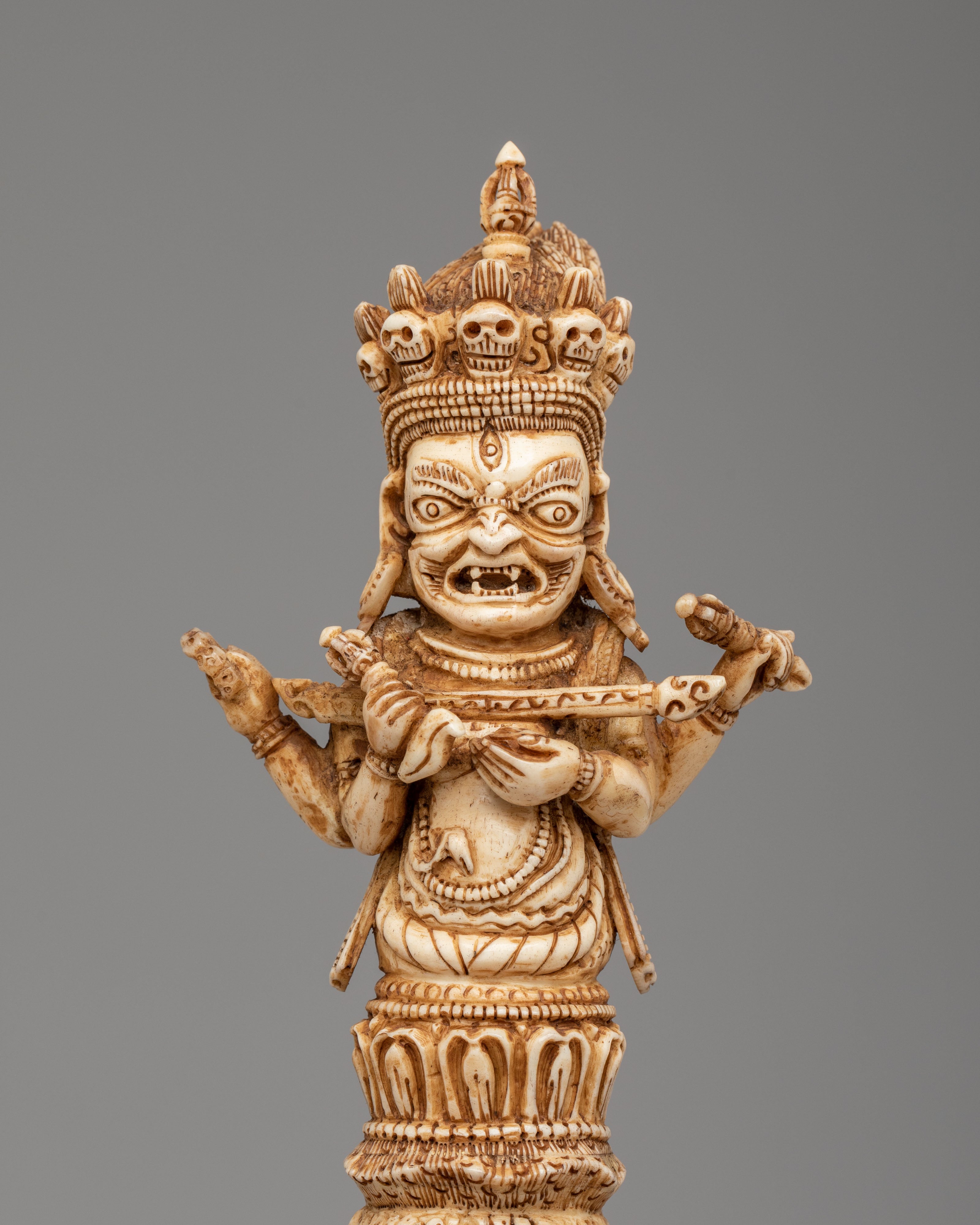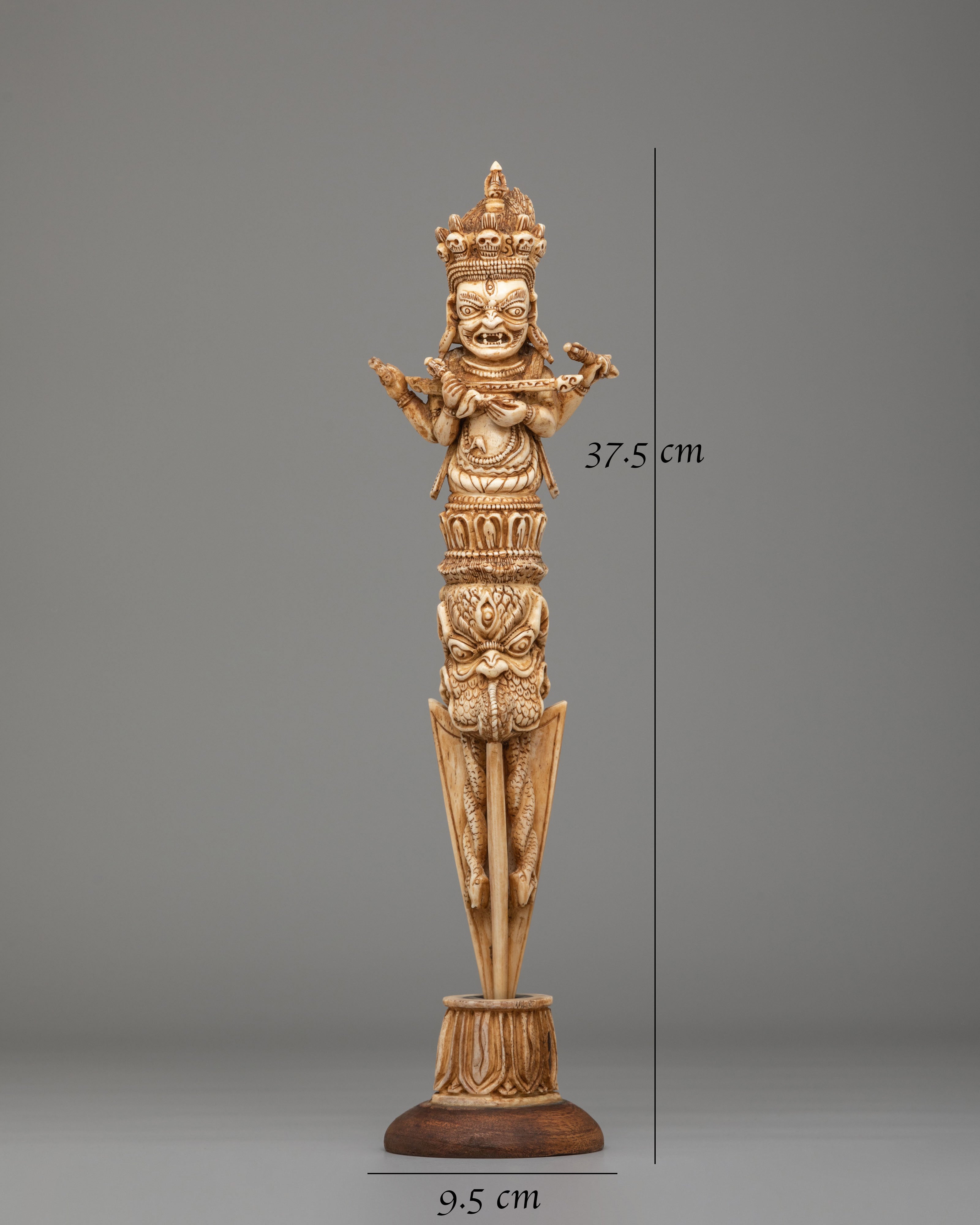 Discover the Himalayan Ritual Phurba, a sacred Tibetan artifact crafted from ethically sourced buffalo bones. This ritual dagger, with intricate carvings, represents the power to cut through negative energies and obstacles. The three-faced design on top of the Phurba symbolizes the union of wisdom, compassion, and power. It is revered for its ability to ward off harmful forces and invoke spiritual protection. The finely detailed craftsmanship showcases the rich Himalayan artistic traditions, making it not only a spiritual tool but also a beautiful piece of cultural heritage.