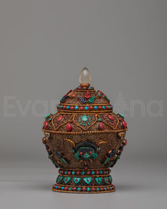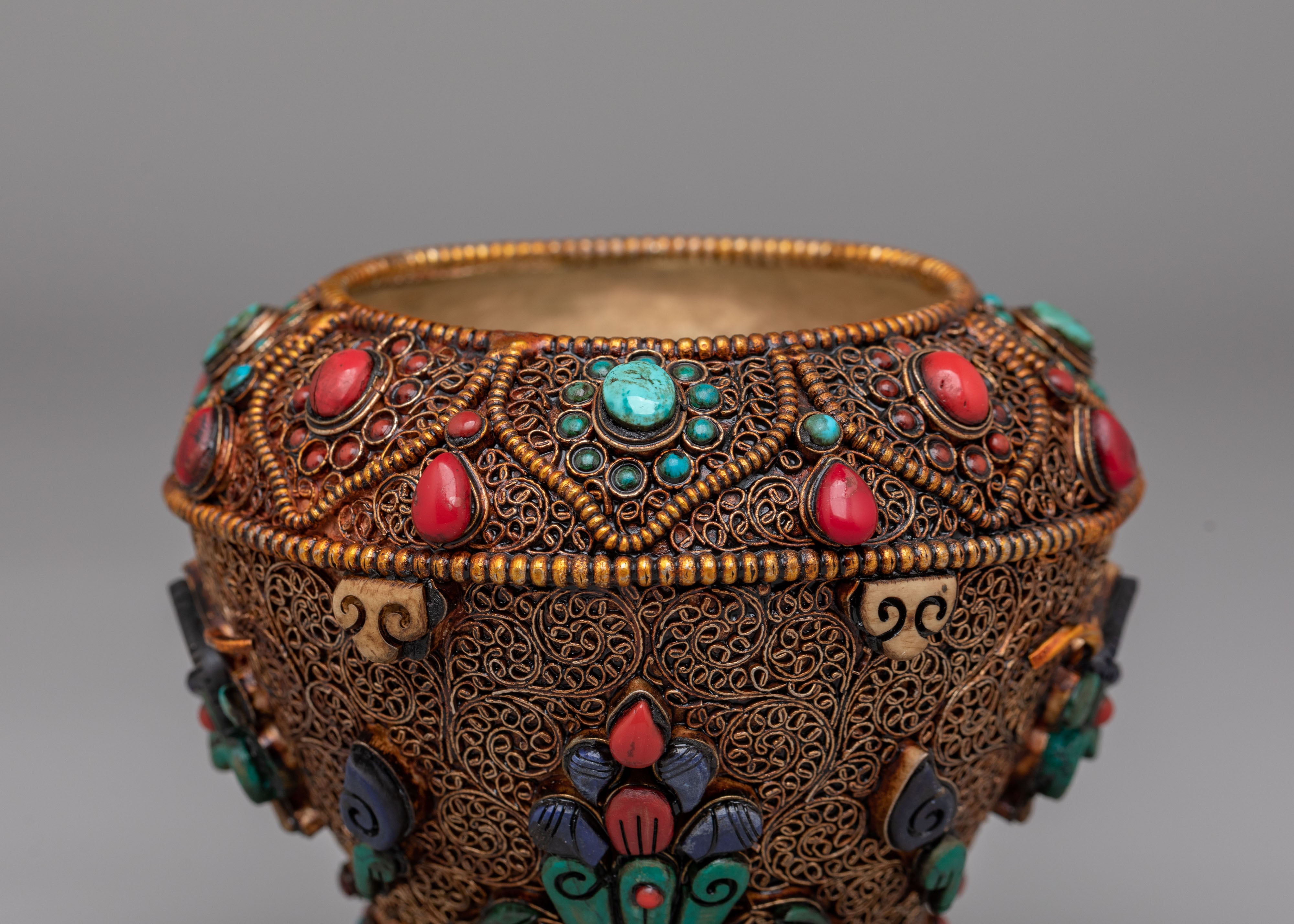 The vibrant coral and turquoise gemstones stand out against the rich gold-plated filigree work. The coral, known for its vibrant red hue, symbolizes vitality and protection, while the turquoise, with its serene blue tones, is considered a stone of healing and spiritual balance. The gold-plated detailing throughout the design represents prosperity and enlightenment, adding a touch of elegance and luxury to this sacred item. The intricate work on the pot's body and lid reflects the craftsmanship of skilled artisans, drawing on centuries of Himalayan and Tibetan culture.