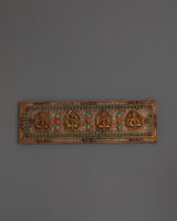 This Holy Book (11.5cm x 35cm, 1.63kg) is an extraordinary handcrafted Buddhist scripture, beautifully designed with intricate carvings of four deities: Manjushri, Amitabha, Vajrasattva, and others. Made from a copper body with gold plating and adorned with artificial turquoise and coral stones, this sacred piece reflects both spiritual reverence and masterful artistry. Used to enshrine Buddhist texts or as a ceremonial offering item, it carries immense cultural and spiritual value.