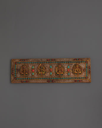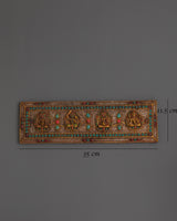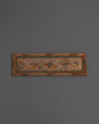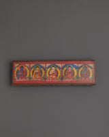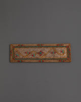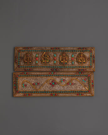 The case features detailed carvings of deities, each symbolizing unique blessings: Manjushri embodies wisdom, Amitabha represents infinite compassion, and Vajrasattva signifies purification. The addition of turquoise and coral stones enhances its spiritual energy, while the fine craftsmanship brings depth and life to the sacred motifs. Whether placed on an altar, used in ritual practice, or displayed as a cultural artifact, this holy book case radiates sacred presence and devotion.