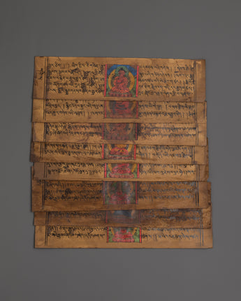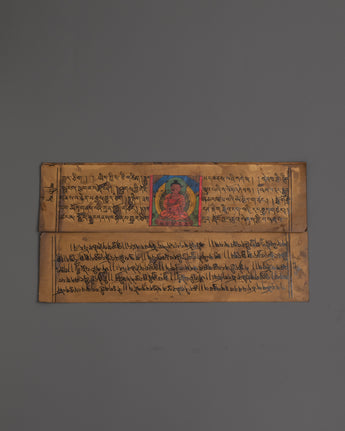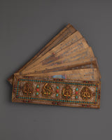 Discover the profound wisdom contained within this sacred book, featuring detailed depictions of the Five Dhyani Buddhas alongside Tibetan script. This sacred text offers deep spiritual insights and traditional teachings, making it an essential companion for anyone seeking enlightenment or a greater connection to Tibetan Buddhist practices.