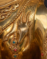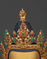 The statue is embellished with a hand-carved gemstone, which adds to its holy beauty and depth. The gold plating emphasizes Chenrezig's celestial attributes, making it an effective complement to any Buddhist altar or spiritual area. This statue's artistry and intricacy elevate it beyond mere decoration to become a powerful symbol of caring energy and spiritual satisfaction.