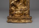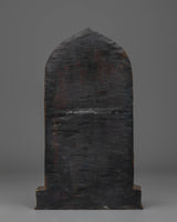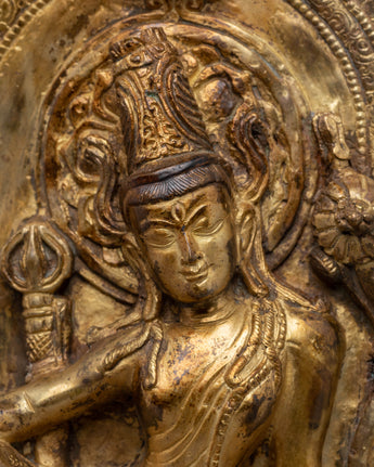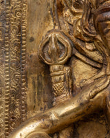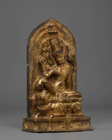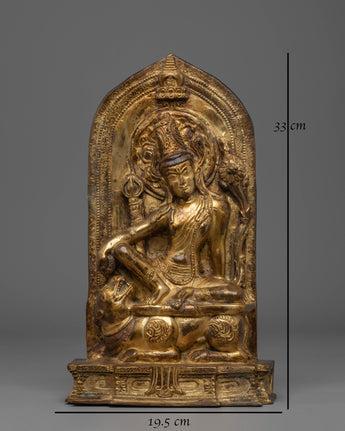 In his iconography, Indra Dev is depicted seated gracefully with his eyes gently closed, evoking a sense of inner stillness and divine contemplation. He is richly adorned with godly ornaments, highlighting his status as the king of the heavens in Hindu tradition. In his left hand, he holds a delicate utpala flower, symbolizing purity and spiritual awakening. His right hand rests upon his knee in a relaxed, grounded gesture, emphasizing both his royal authority and serene presence. This peaceful portrayal reflects his role as a celestial guardian and ruler of divine realms.
