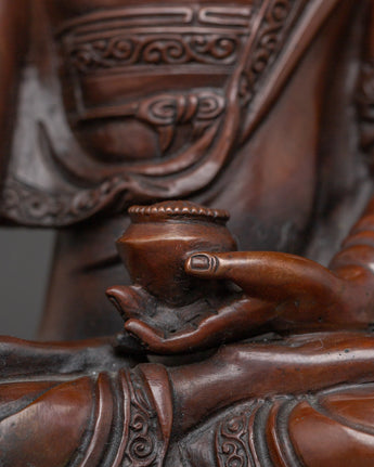 The statue of Ratnasambhara features an ushnisha on top of his head, symbolizing enlightened wisdom. He performs the varada mudra, a gesture representing generosity and the granting of blessings. In his right hand, he holds an alms bowl, which signifies compassion and the act of providing sustenance. Adorned with large earrings and dressed in a monastic robe, he sits peacefully in vajrasana (diamond posture) on a moon-disc lotus base, symbolizing purity and spiritual awakening.