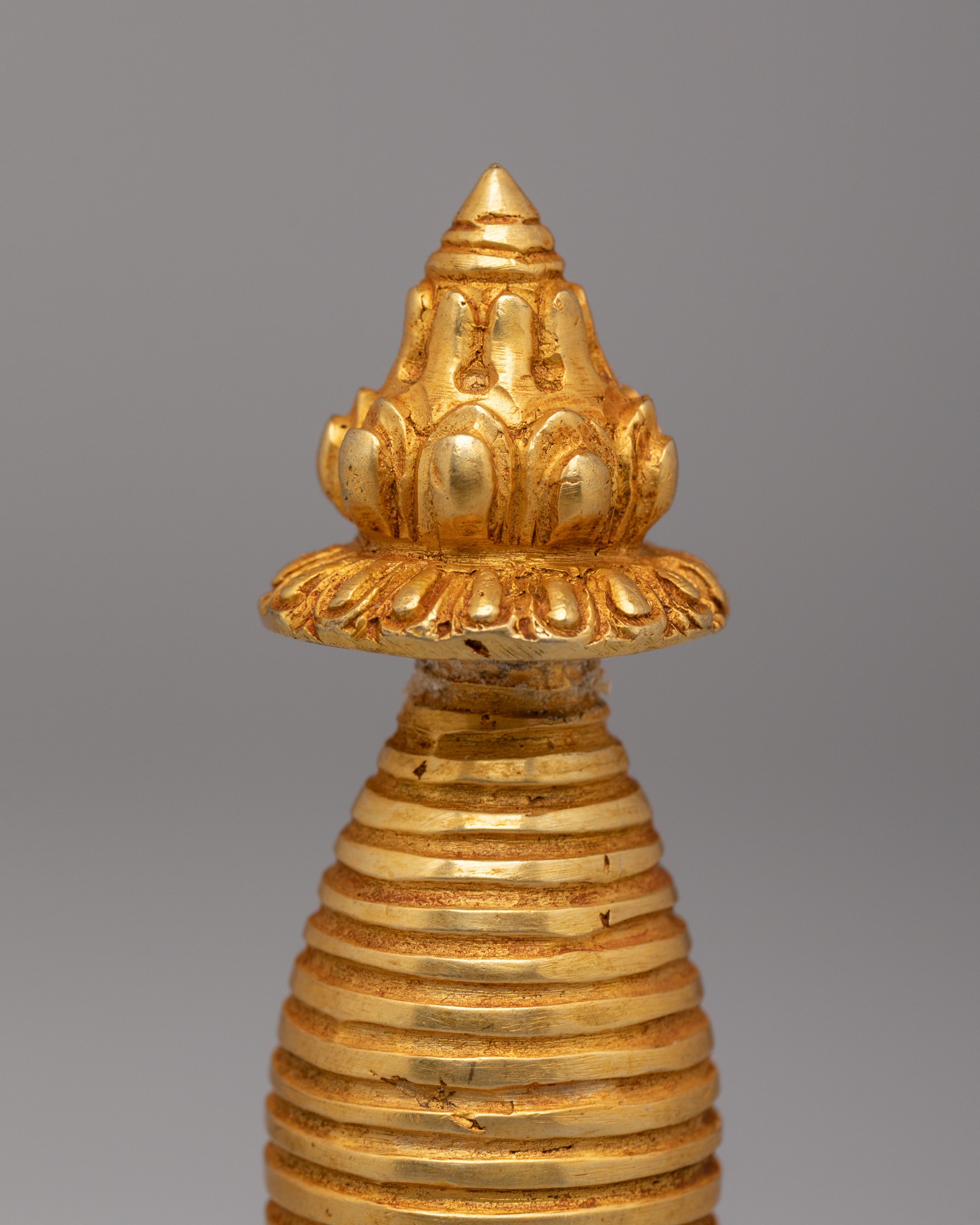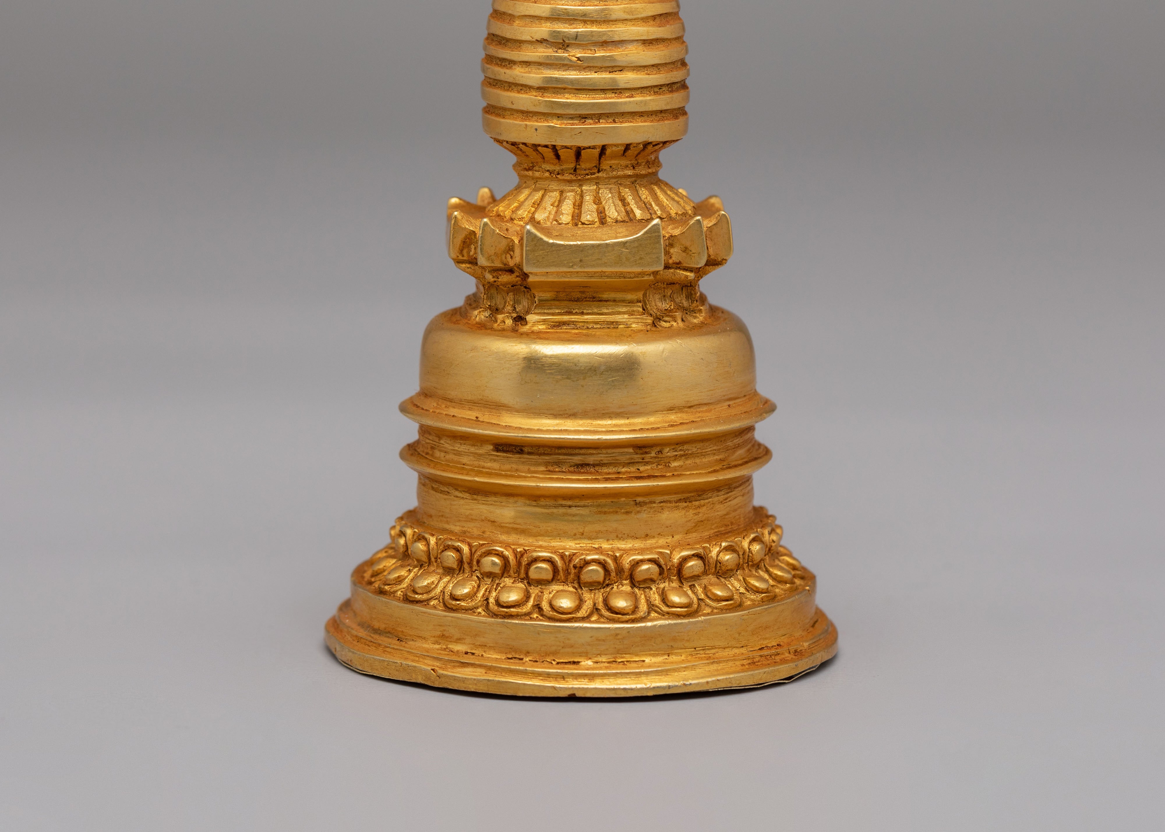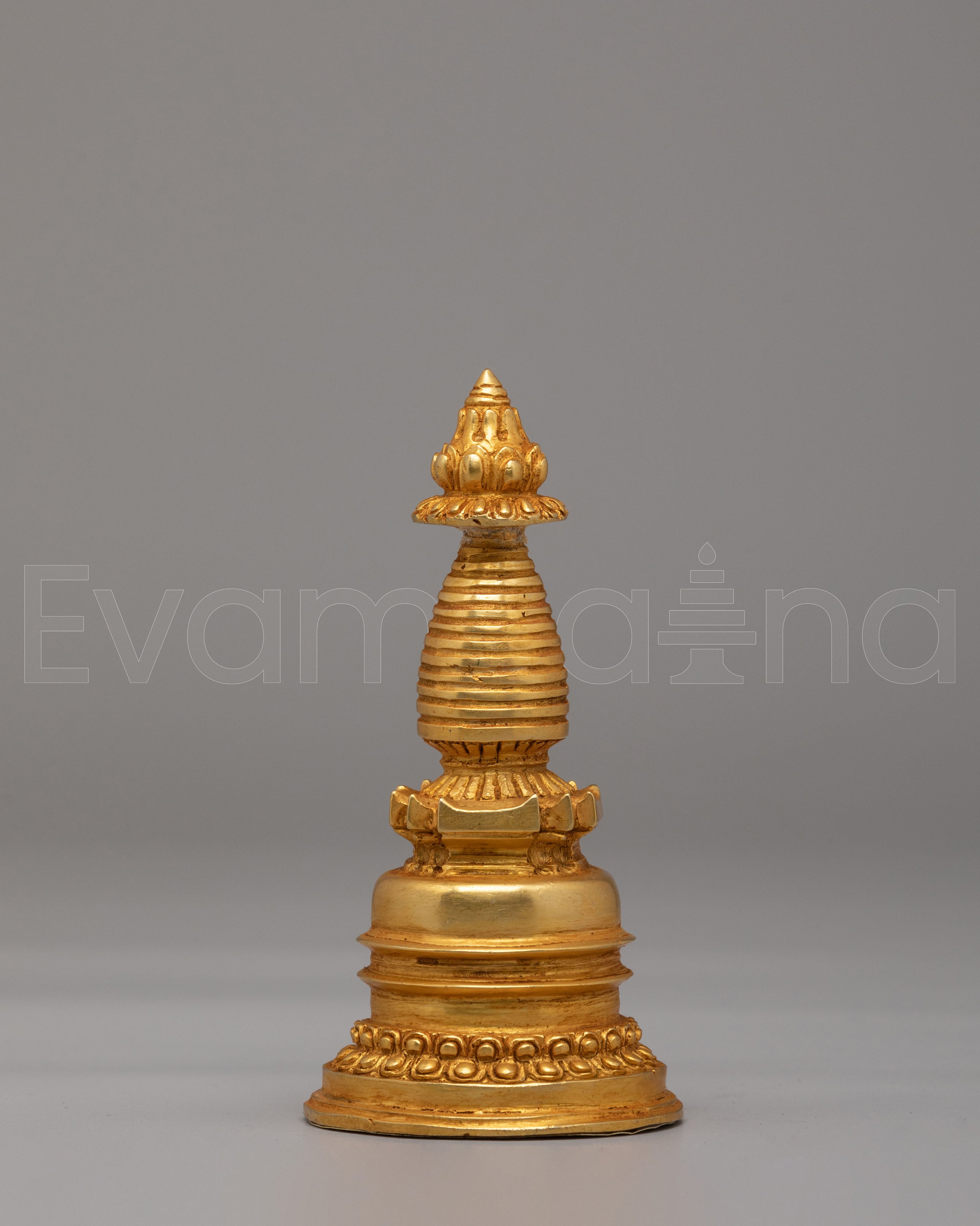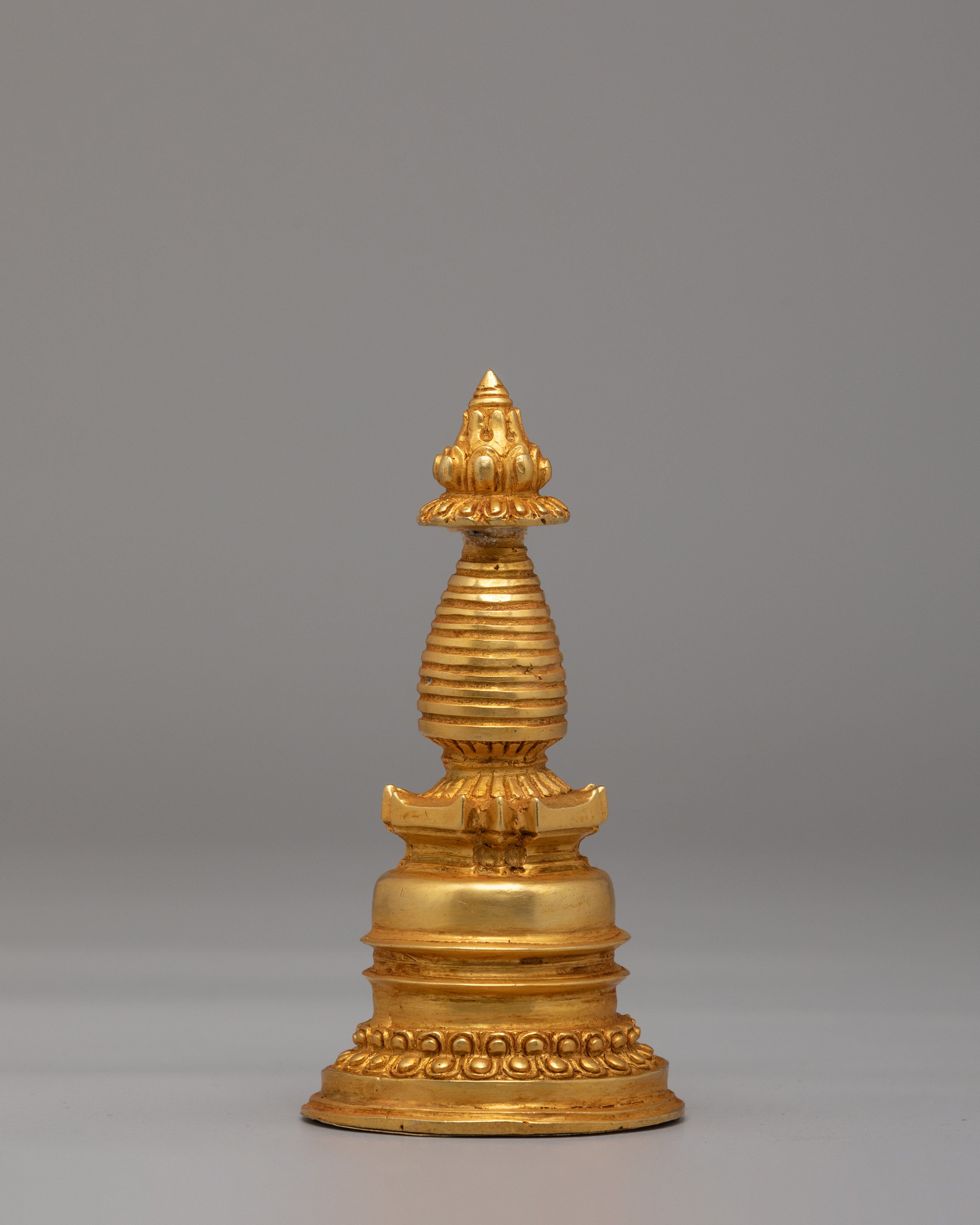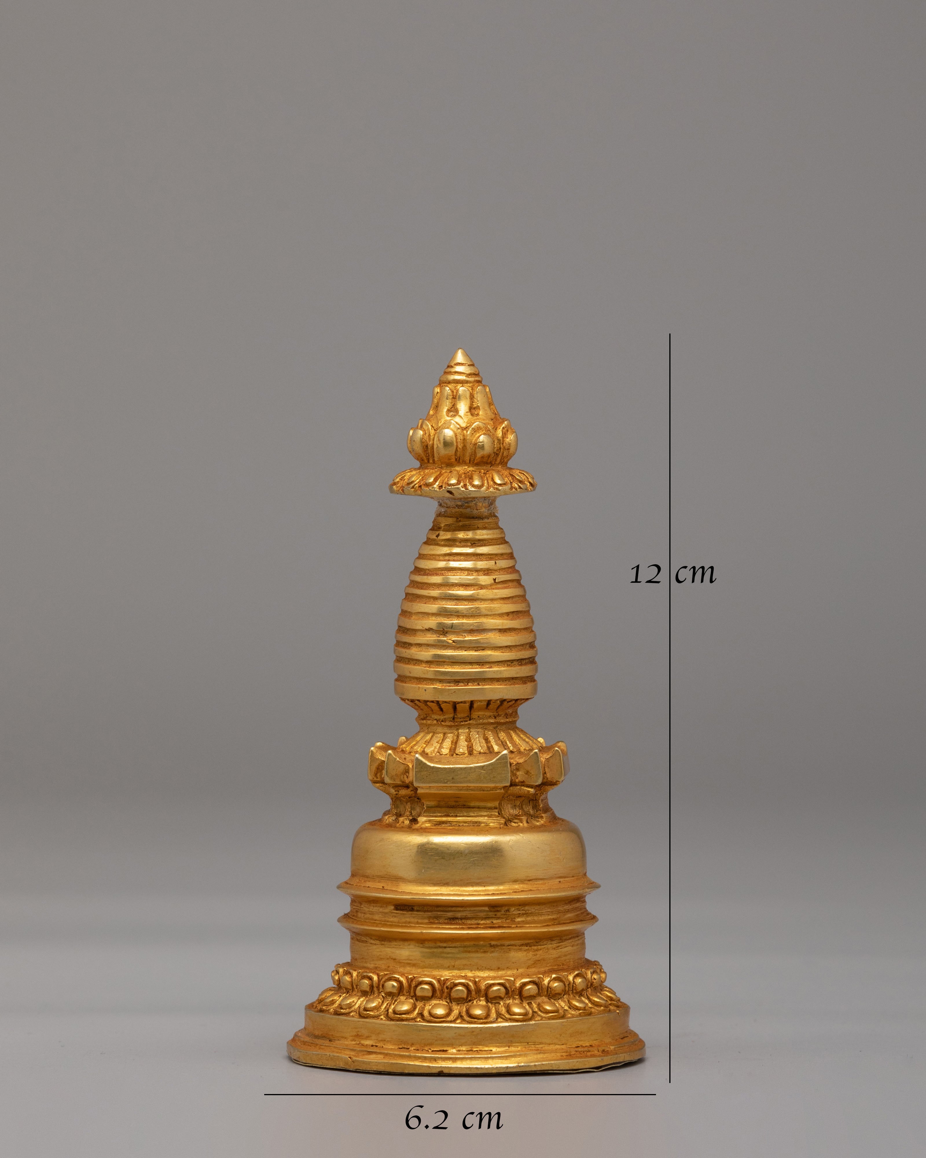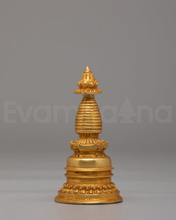 The detailed craftsmanship of this Kadampa Stupa reflects the sacredness of the Buddhist teachings. The gold plating adds a radiant glow to the piece, enhancing its spiritual significance and making it an ideal addition to any altar or meditation space. The design incorporates traditional Buddhist motifs, including the spiral at the top, representing the enlightened mind and the infinite wisdom that transcends worldly limitations.