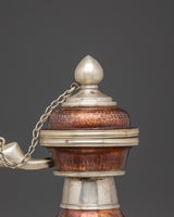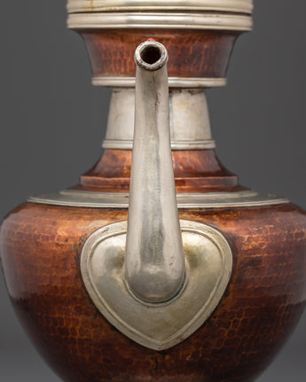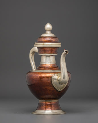 Experience the elegance of Tibetan craftsmanship with this handcrafted Tibetan Kettle, expertly made from copper and silver-plated for a refined, finish. Standing 35 cm tall, this kettle combines functionality with spiritual significance, perfect for brewing tea during rituals or as a striking decorative piece. Its traditional design captures the essence of Tibetan culture, making it a meaningful addition to meditation spaces, altars, or any setting focused on mindfulness and tranquility. Elevate your daily tea ritual and bring a touch of sacred artistry into your home with this exquisite kettle.