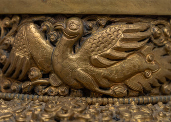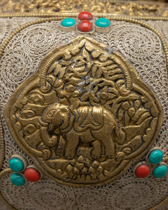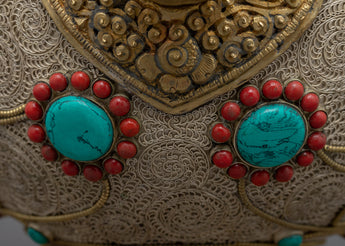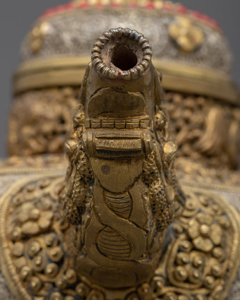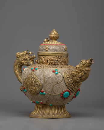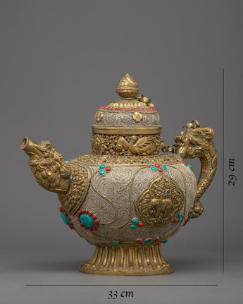Indulge in the exquisite artistry of this Large Buddhist Tea Pot, meticulously handcrafted on a copper body and adorned with lustrous silver and opulent 24k gold plating. The tea pot's dragon handle adds an aura of mystique and power, symbolizing protection and prosperity. Its majestic presence is further enhanced by the skillful inlay of gemstones, adding a touch of elegance and luxury to this divine masterpiece. Immerse yourself in the ancient ritual of tea, as you pour steaming goodness from this resplendent pot, invoking a sense of tranquility and serenity within your sacred space. Embrace the harmonious blend of traditional craftsmanship and spiritual significance that this teapot exudes, and let it elevate your tea ceremonies to a celestial experience.