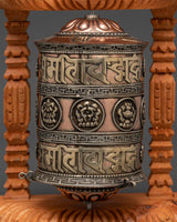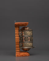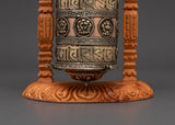 This large, handcrafted prayer wheel, crafted from copper and brass, is a holy item of profound significance in Tibetan Buddhist traditions that can elevate your spiritual practice. With its elaborately engraved mantras and carved wooden frame measuring 18cm in width and 21cm in height, this prayer wheel exudes both visual beauty and strong spiritual force.