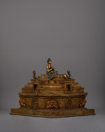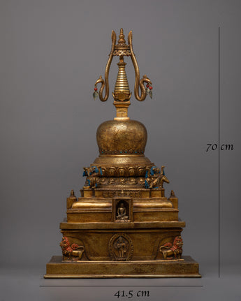 - This stupa has been meticulously designed and manufactured down to the last detail. The parasol-adorned central tower represents the layers of illumination. The base, which reflects the rich imagery of Buddhist art, is adorned with mythological animals, vibrant inlays, and niches holding sacred images.