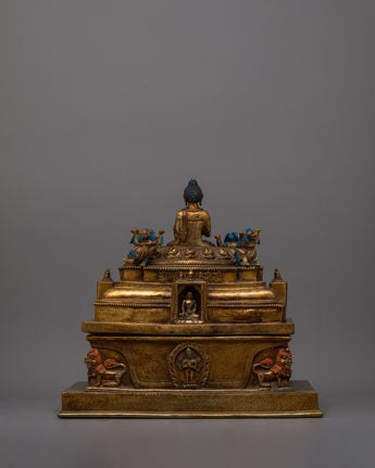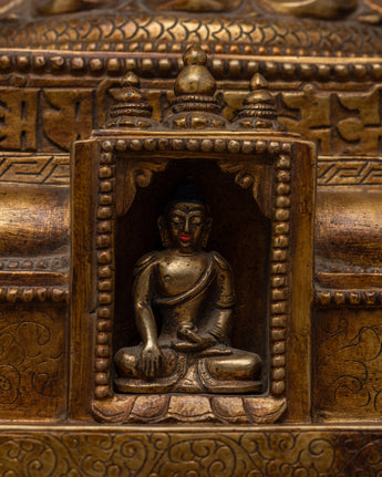 This stunning handcrafted Buddhist Stupa Statue is a unique combination of commitment and artistry that will elevate your spiritual environment. This exquisitely created statue, which is gold-plated over a Copper body, exudes a sense of grandeur and sacredness, making it the ideal focal point for any altar, meditation area, or interior design.