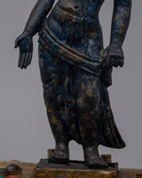 Infuse your sacred space with the tranquil presence of this Lokeshvara Avalokiteshvara statue, which is beautifully created to represent compassion and knowledge. This statue, handcrafted from copper and embellished with original lapis lazuli stones, exudes spiritual beauty and elegance. The delicate inlay of artificial coral and turquoise stones adds to its holy aura, creating a compelling focus point for meditation and contemplation.