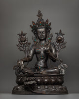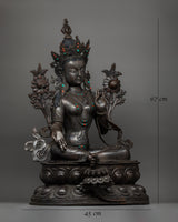 Green Tara is depicted with elegance and compassion, seated in a ready stance with one leg outstretched to respond quickly in times of need. Her right hand is in the varada mudra, indicating infinite giving, while her left hand is holding a utpala lotus, which represents purity and spiritual enlightenment. The oxidized copper body accentuates her heavenly and protecting the aura, making this statue an effective spiritual instrument for evoking Tara's blessings of protection, compassion, and direction on the path to enlightenment.