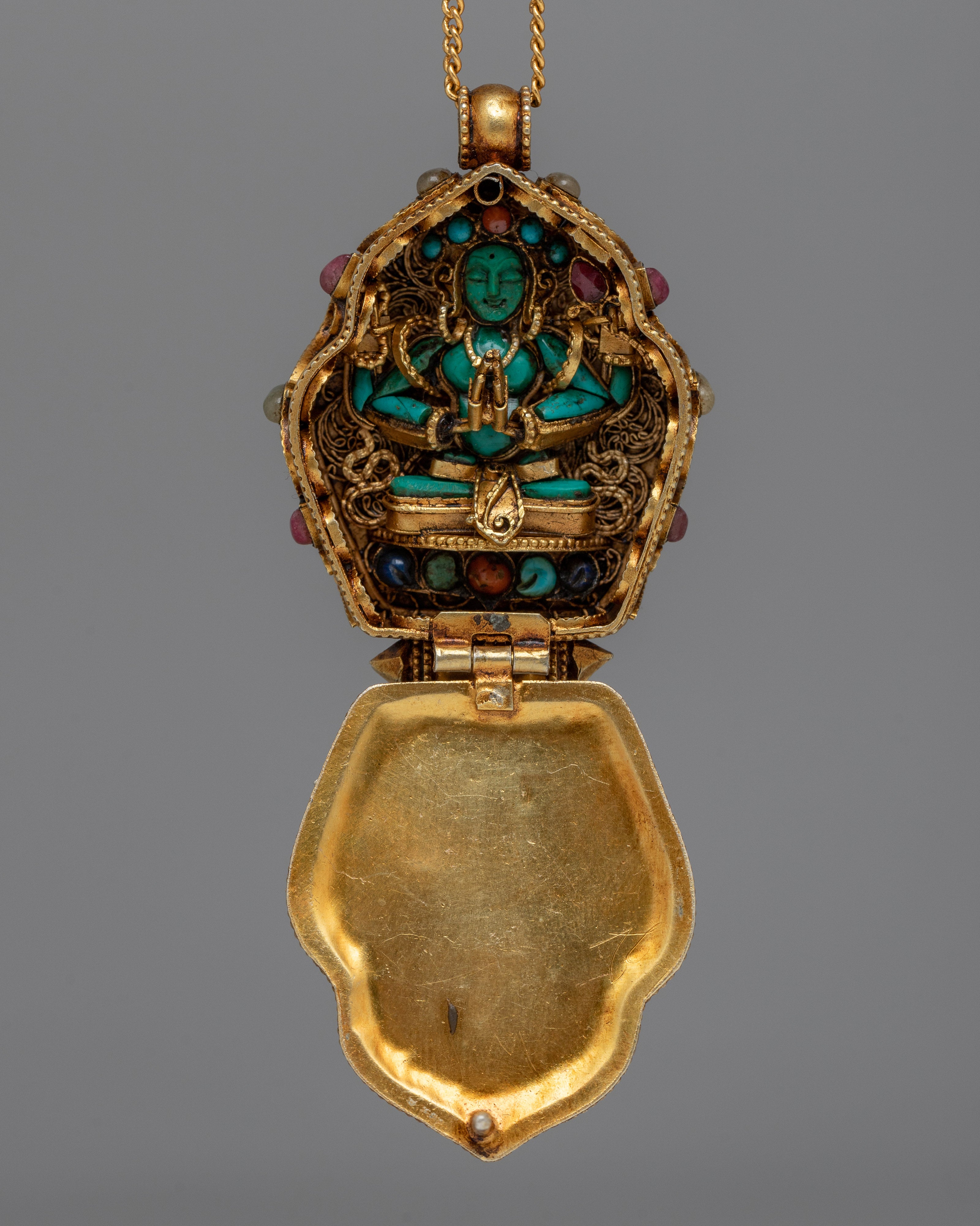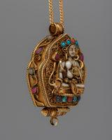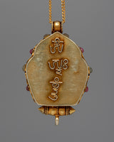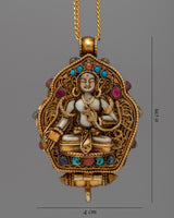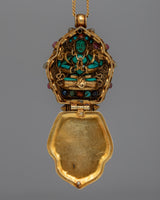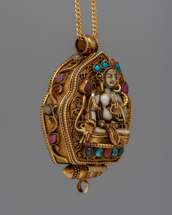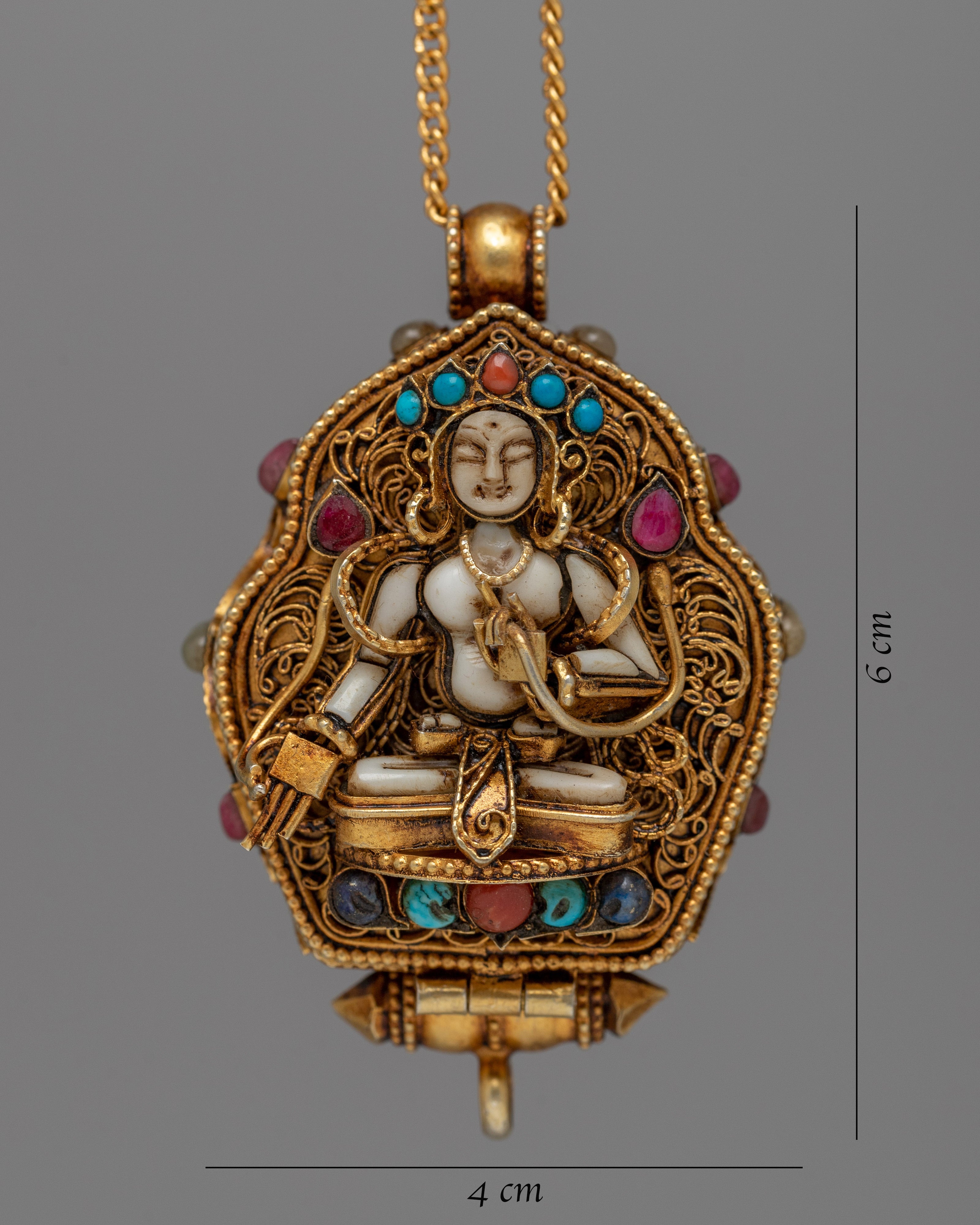 Experience the profound peace of the Tara Prayer Ghau, a sacred symbol of spiritual devotion and protection. This ghau, meticulously created in silver and decorated with genuine gemstones such as lapis lazuli, turquoise, coral, and conch shell, each with its own importance, exudes ageless beauty and reverence. With dimensions of 6cm in height and 4cm in width, and a weight of 0.05kg, it is a concrete representation of trust and inner calm.