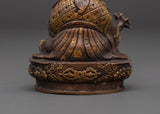 This Lotus Born Master Rinpoche Statue, made from oxidized copper to showcase the profound spiritual essence and traditional artistry of Tibetan Buddhist sculpture, honors the heritage of the great Vajrayana teacher. This small yet potent statue, which stands 10.5 cm tall by 7 cm wide and weighs 0.45 kilogram, is a representation of the famed enlightened figure who introduced Buddhism to Tibet, Guru Padmasambhava. Protection, introspection, and the dispersing of negative energy are all encouraged by his calm yet powerful presence.