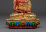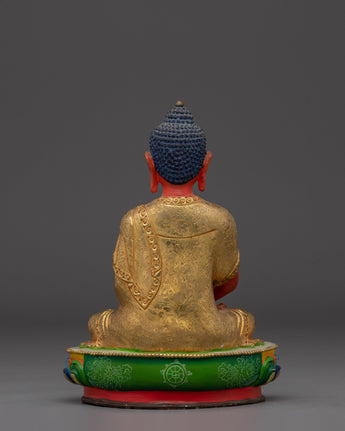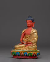 Lotus Seated Amitabha Buddha measures 20 cm (7.9 inches) in height and 15.5 cm (6.1 inches) at the base, with a weight of 1.38 kg. Expertly made from a copper body, it is gilded with 24K gold and adorned with detailed acrylic paintings.