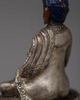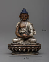 We present the Buddha Amitabha Statue, which is finely sculpted on an oxidized copper base with machine made and finished with silver plating. This statue, which is only 6 cm tall, is a representation of Amitabha Buddha, who is revered for his boundless life and radiance. The figure's calm countenance and fine details are subtly brought to life by the silver plating, which also gives it a reflected sheen that heightens its spiritual presence.