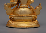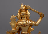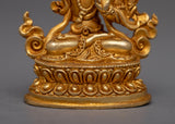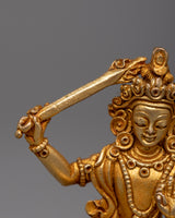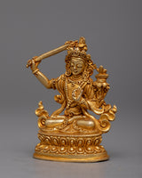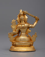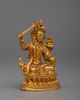 The gorgeous Manjushri Statue is machine-made from copper and exquisitely plated in 24k gold. This statue, which is 6 cm tall, is a representation of Manjushri, the Bodhisattva of Wisdom, who is renowned for using his fiery sword to vanquish ignorance. The delicate details are accentuated by the gold plating, which highlights his elegant face and the symbolic objects he is holding.