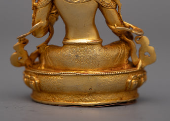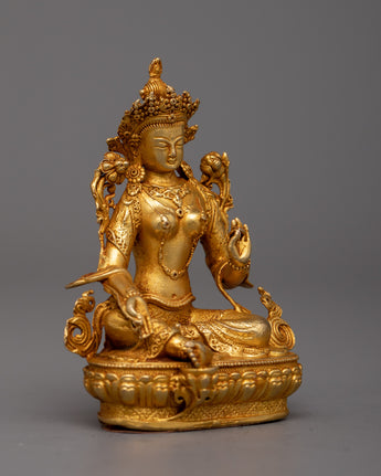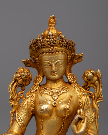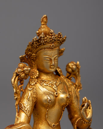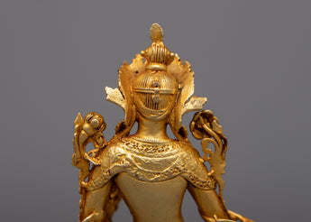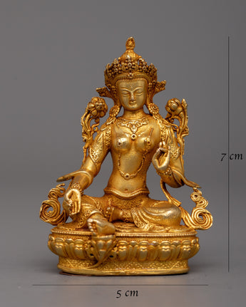 The Machine-made Green Tara Statue, standing at a modest height of 7 cm, represents Green Tara's loving and caring traits as the embodiment of enlightened activity. This statue, expertly crafted from copper using advanced machine techniques, represents the graceful and calm essence of the Green Tara symbol. Its shiny 24k gold plating creates an aura of divine energy and spiritual empowerment.