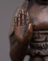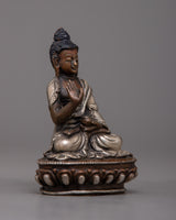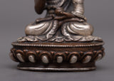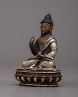 The 8-cm-tall Machine Molded Amoghasiddhi Buddha Statue symbolizes the enlightened attributes of bravery and achievement. This sculpture, which was created by a machine on a body of oxidized copper and then finished with silver plating, represents the spiritual essence of Amoghasiddhi.