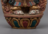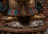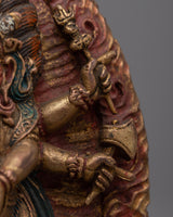 The Mahakala Statue is a magnificent and intricately handcrafted piece made from copper. The statue is adorned with exquisite details and features 24k gold plating, adding a touch of opulence to its appearance. Mahakala, a powerful deity in the Buddhist tradition, is depicted standing upon a lotus base, symbolizing purity and spiritual enlightenment. The craftsmanship of this statue captures the essence and presence of Mahakala, radiating strength, protection, and compassion. With its remarkable design and spiritual significance, the Mahakala Statue is a stunning centerpiece for any sacred space or personal altar.