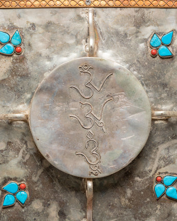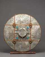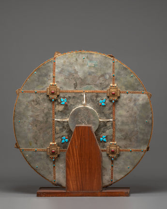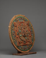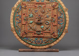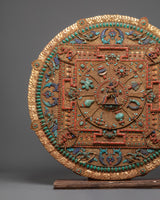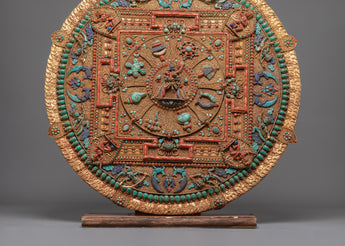 This Mandala for Home Decor is a magnificent example of Tibetan craftsmanship, combining spiritual symbolism with a bright style. This elaborate mandala stands 55cm tall, 55.5cm wide, and weighs 8.03kg. It is crafted from copper, finished with gold plating and beautiful filigree work. The use of Lapis Lazuli and Turquoise stones heightens its sacred energy, making it an ideal addition to your meditation room, altar, or spiritual space. This mandala represents peace, balance, and enlightenment, providing both spiritual instruction and visual beauty to your house.