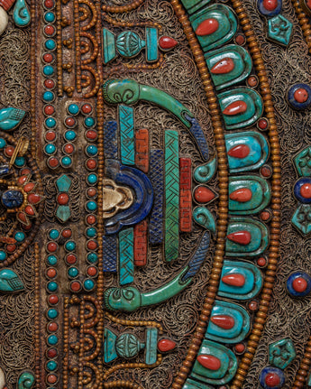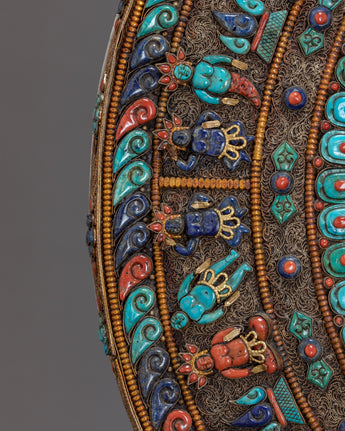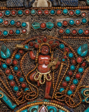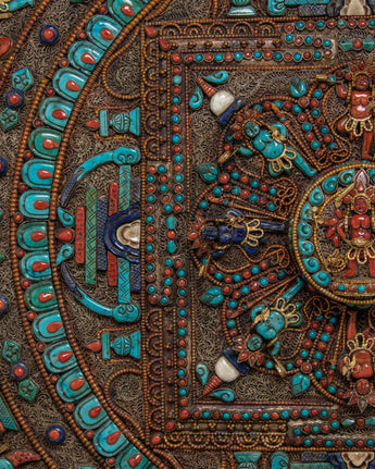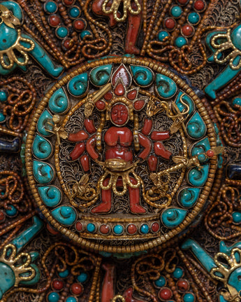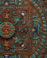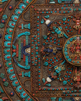 This is a very rare round Yogini Mandala fully made up of copper, handcrafted with original gemstone inlays, beautiful piece of wall art decor. The front cover of this mandala is removable and will be a perfect decoration for your living room, bedroom, or office. If you are looking for the best decoration for your home, you are in the right place!