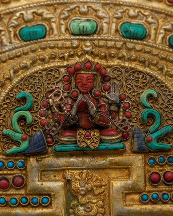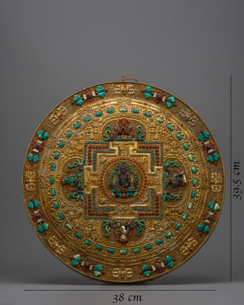 Introducing our exquisite Mandala Wall Hanging Metal Thangka, an exceptional piece with an electro-gold-plated copper body. This Thangka, weighing 1.6 kg and measuring 39.5 cm in height by 38 cm in width, is a powerful expression of artistic genius and spiritual enlightenment. At its center, a meticulously crafted Buddha is surrounded by other deities, creating a harmonious and sacred representation. The intricate design features original lapis lazuli and turquoise, which infuse the piece with genuine spiritual significance. Artificial coral is also incorporated to enhance its visual appeal, creating a captivating color combination.