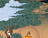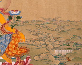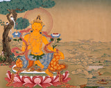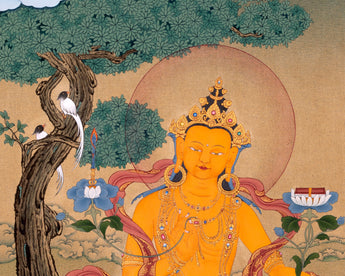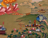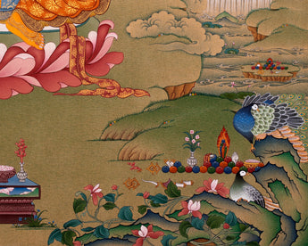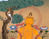 Natural stone color and 24K gold are used to paint this Manjushri Bodhisattva Thangka. He is adorned with jewels and sits atop a moon disc lotus throne beneath a green tree on the top hillside of the flowing river. The artist meticulously positioned the deity, offerings, birds, and flowers, making thangka even more appealing.