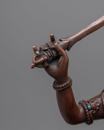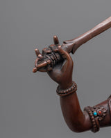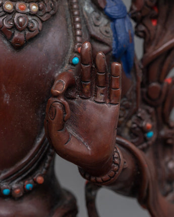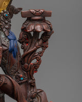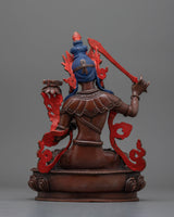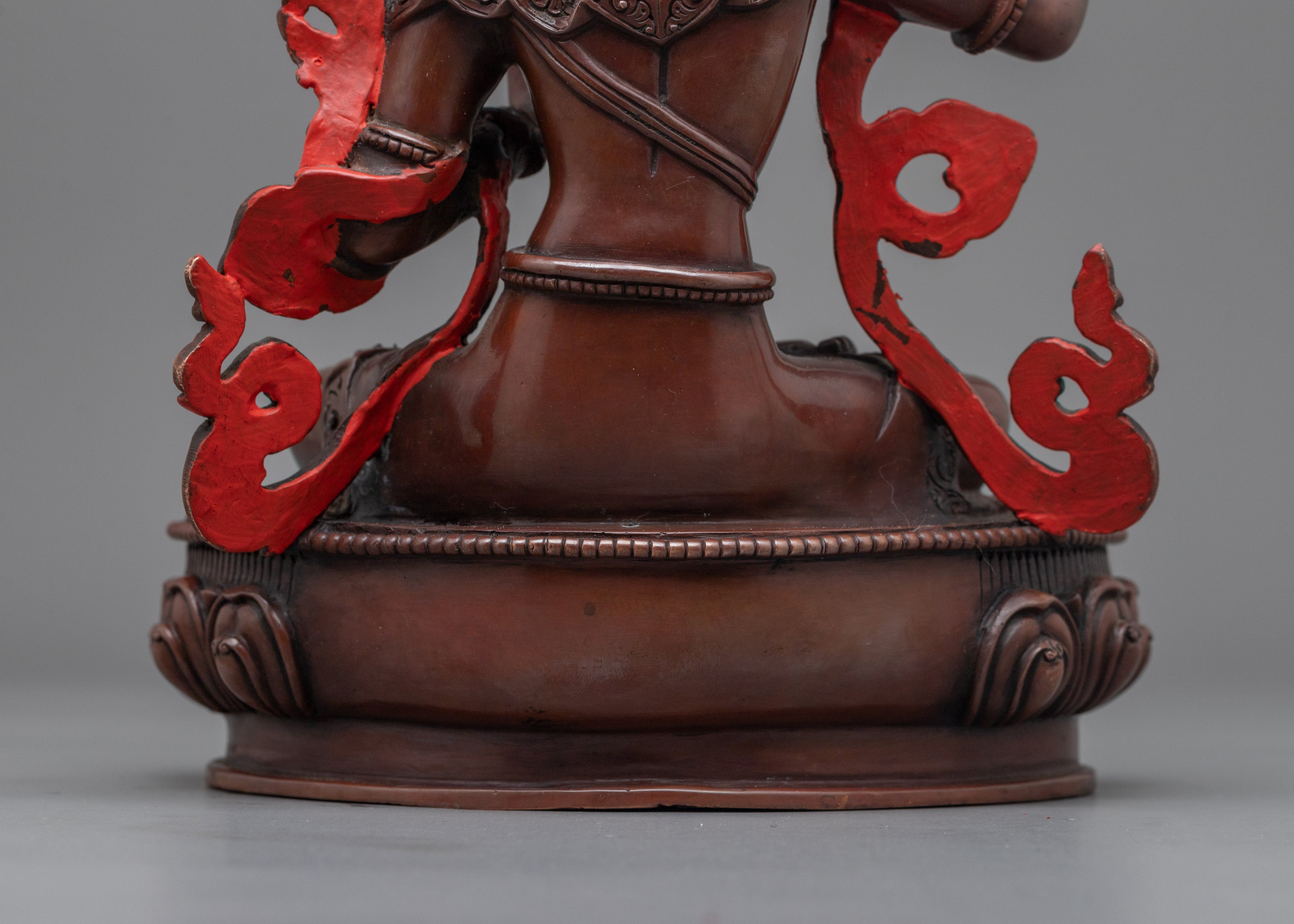 The Manjushri Oxidized Figurine will illuminate your path to enlightenment. This sculpture, which was created by skilled craftspeople, conveys knowledge and intelligence. With a height of 11.2 inches and a base diameter of 7.9 inches, its stunning design enthralls the viewer. This statue, with its oxidized copper body adorned with paintings in gold and acrylic, represents Manjushri's enlightened wisdom.