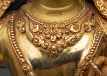 This stunning Tibetan Manjushri Statue is made from a copper body with 24K gold gilding, and depicts a deity with a calm expression seated atop a moon disc lotus seat. The deity is shown holding a wisdom sword in his right hand, symbolizing the power to cut through ignorance and delusion, and a lotus in his left represents purity and enlightenment.