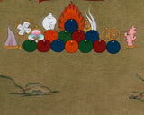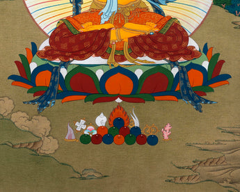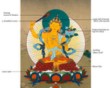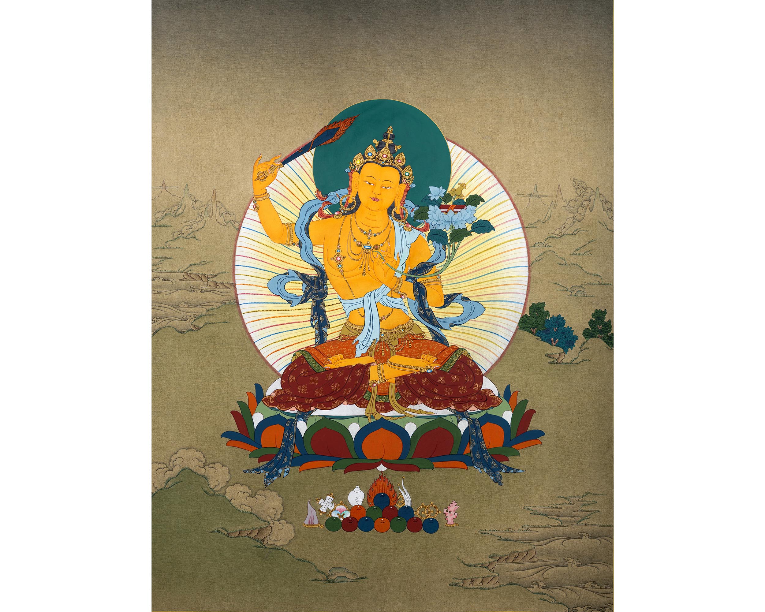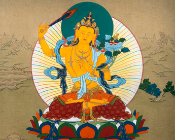 Manjushri is a religious male bodhisattva. He is the embodiment of the wisdom of all the Buddhas realizing the ultimate nature of reality. It is also believed that worshiping Manjushri brings wisdom and intelligence.In this thangka, Manjushri's body is in yellow color. He is seated in the center of the thangka holding a sword of wisdom and a fully bloomed lotus on this left hand. He is adorned with rich and precious ornaments