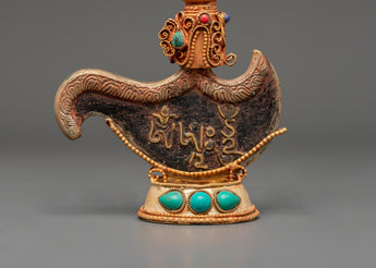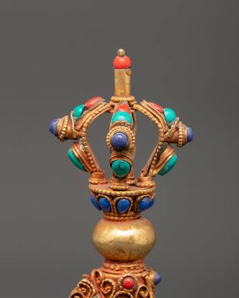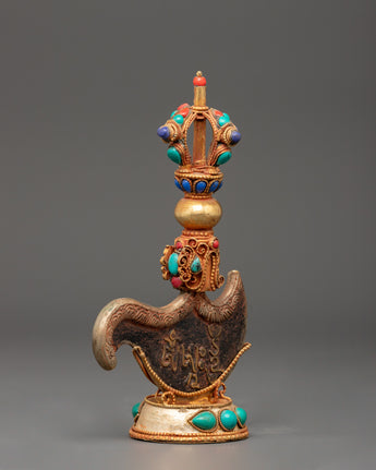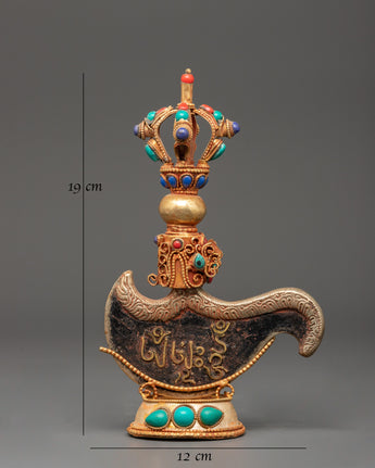 This mantra-engraved Kartika Knife, standing 19 cm tall with a width of 12 cm and weighing 0.292 kg, is beautifully crafted from copper and gold-plated materials—the knife's top features a half vajra, symbolizing the union of wisdom and compassion. The upper part of the curved knife is intricately floral carved, adding delicate detail to its functional form. The base of the knife is curved, highlighting the elegant symmetry of the overall piece. Adding semi-precious stones such as Lapis Lazuli, Coral, and Turquoise further enhances its aesthetic appeal.