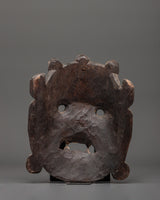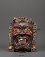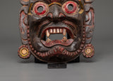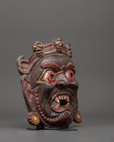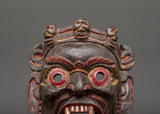 This wooden mask decor features a wrathful expression, highlighted by its three-jewel crown, which signifies the supremacy of the deity it represents. The intense gaze and sharp, threatening teeth give the mask a fierce aura, often used in protective or ritualistic contexts within various spiritual traditions. The detailed carving of the face further emphasizes the anger and force, with intricate lines and strong facial features conveying the mask's power and strength.